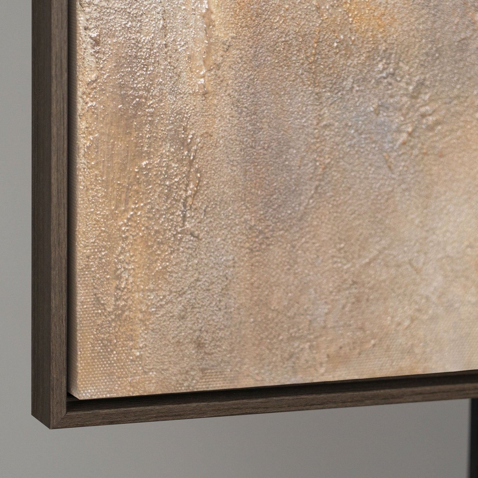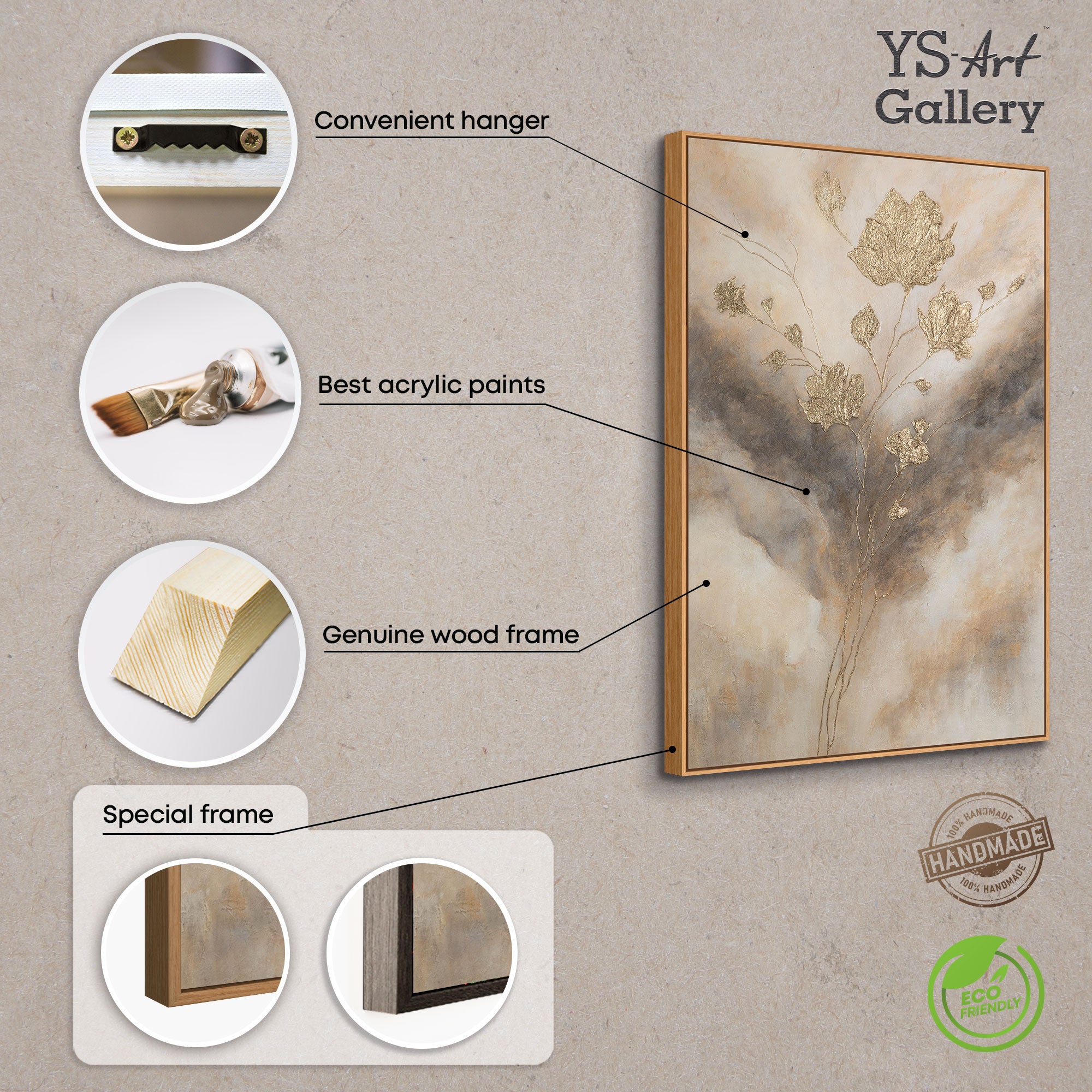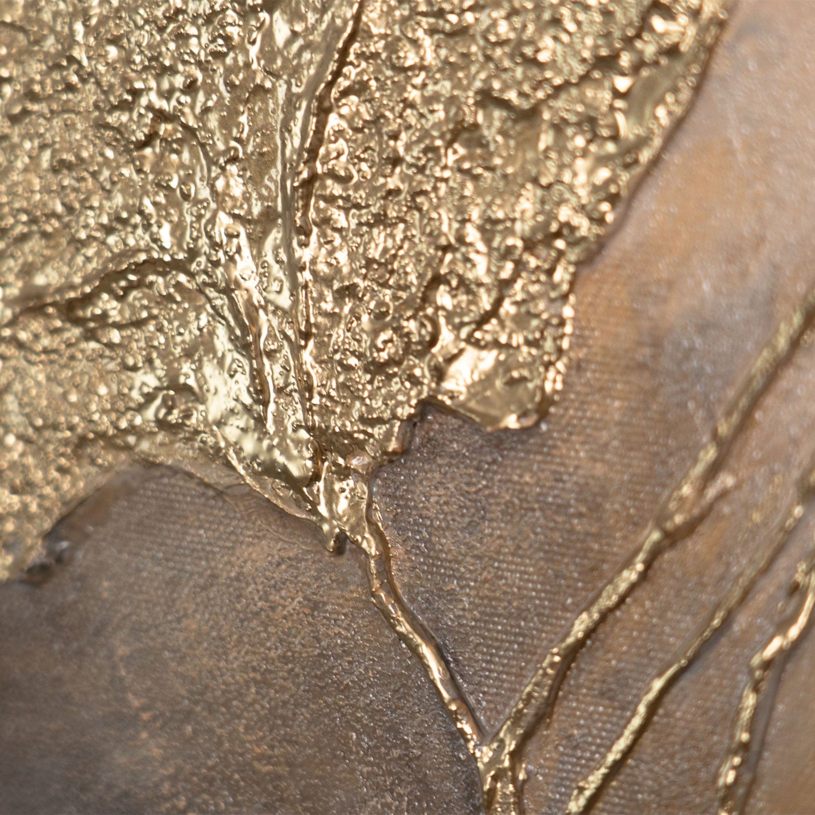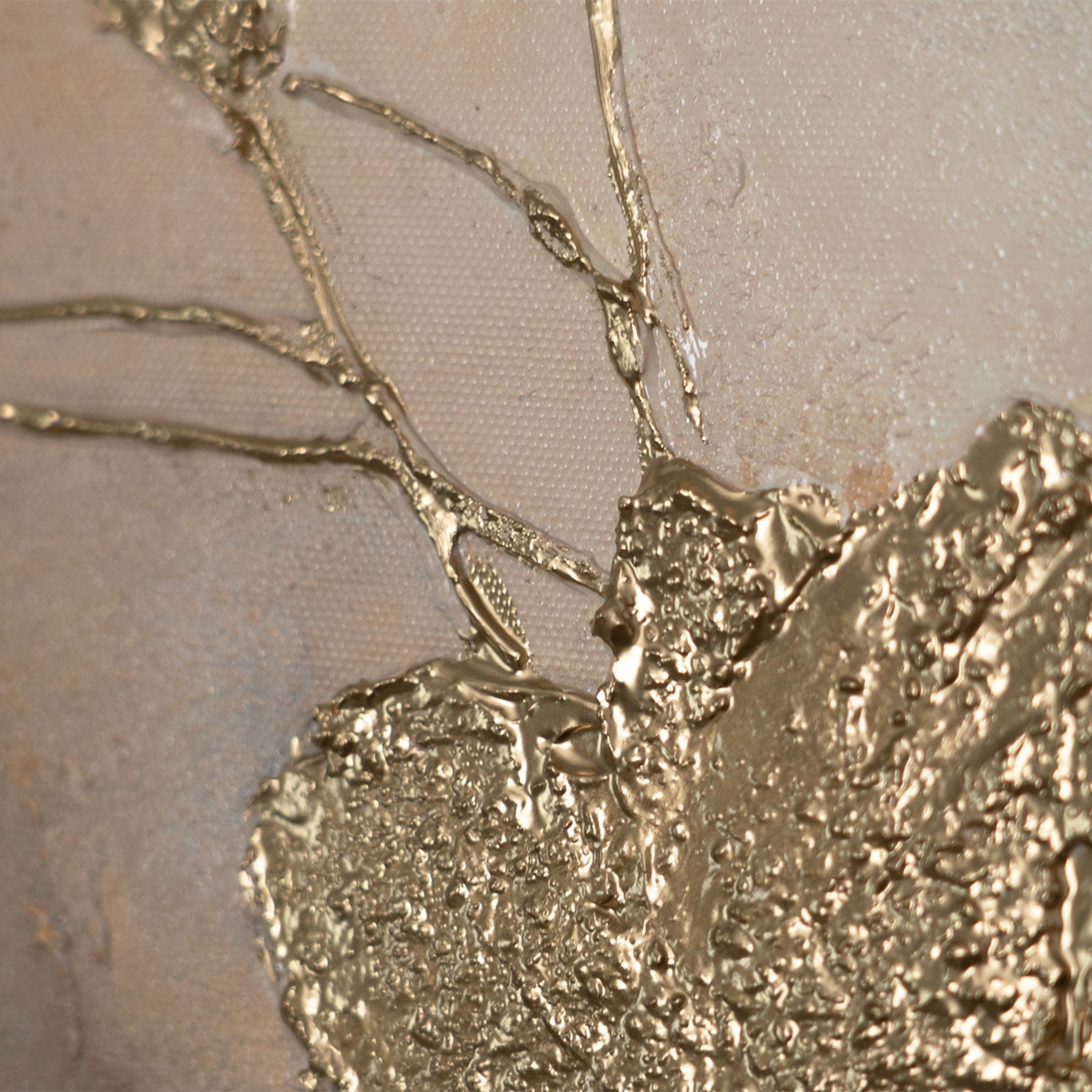 Ten obraz łączy delikatność kolorystyki z elegancją złotego blasku. Na tle delikatnych szaro-beżowych odcieni rozkwitają reliefowe kwiaty, wykonane złotymi akcentami. Wydają się świecić przez chmury, tworząc wrażenie lekkości i szlachetnego luksusu.