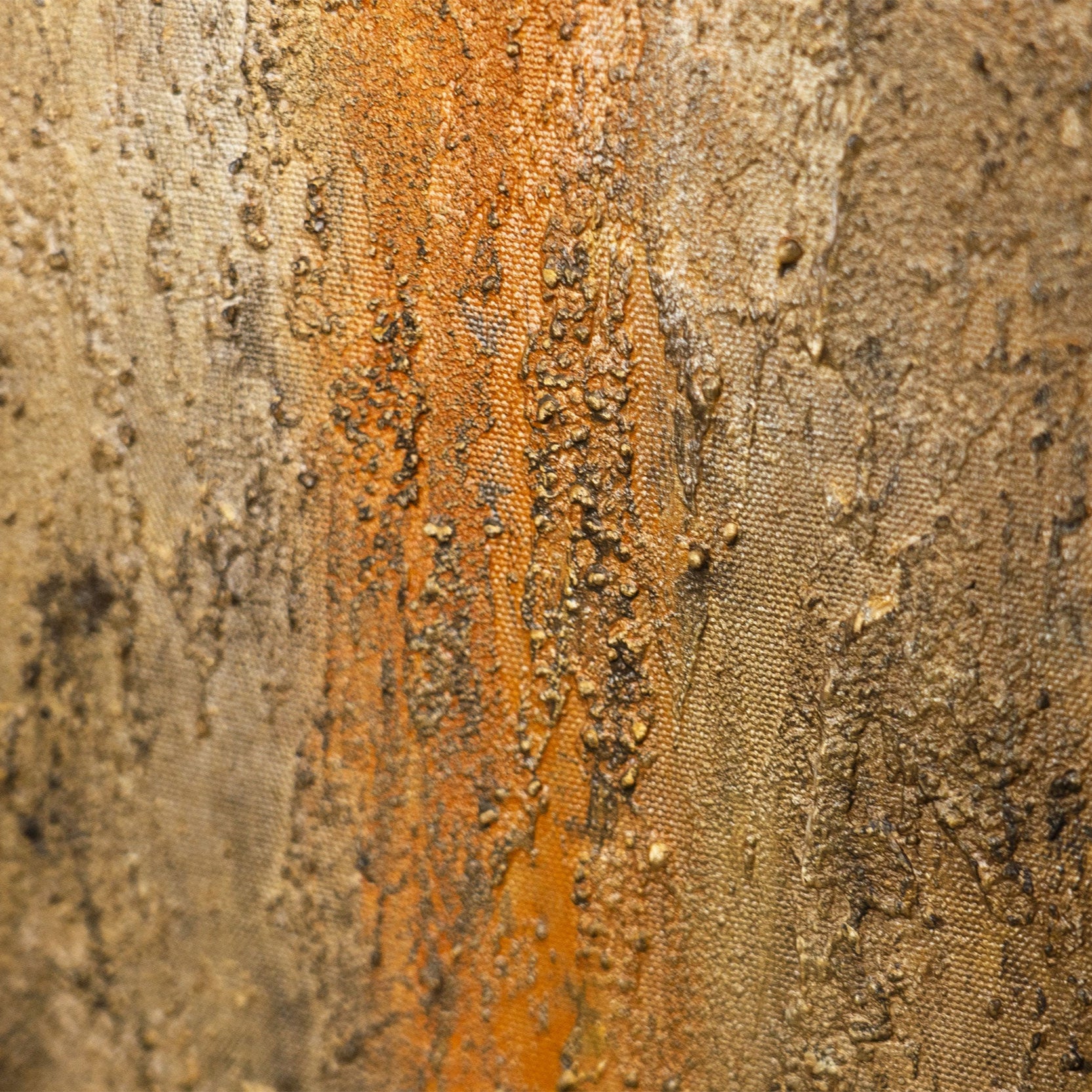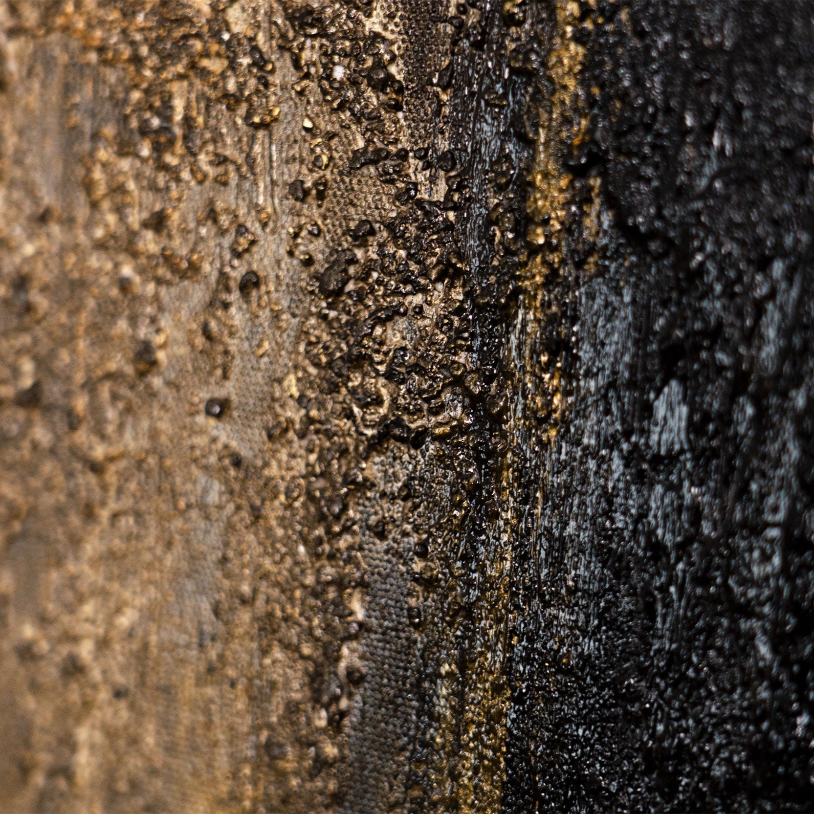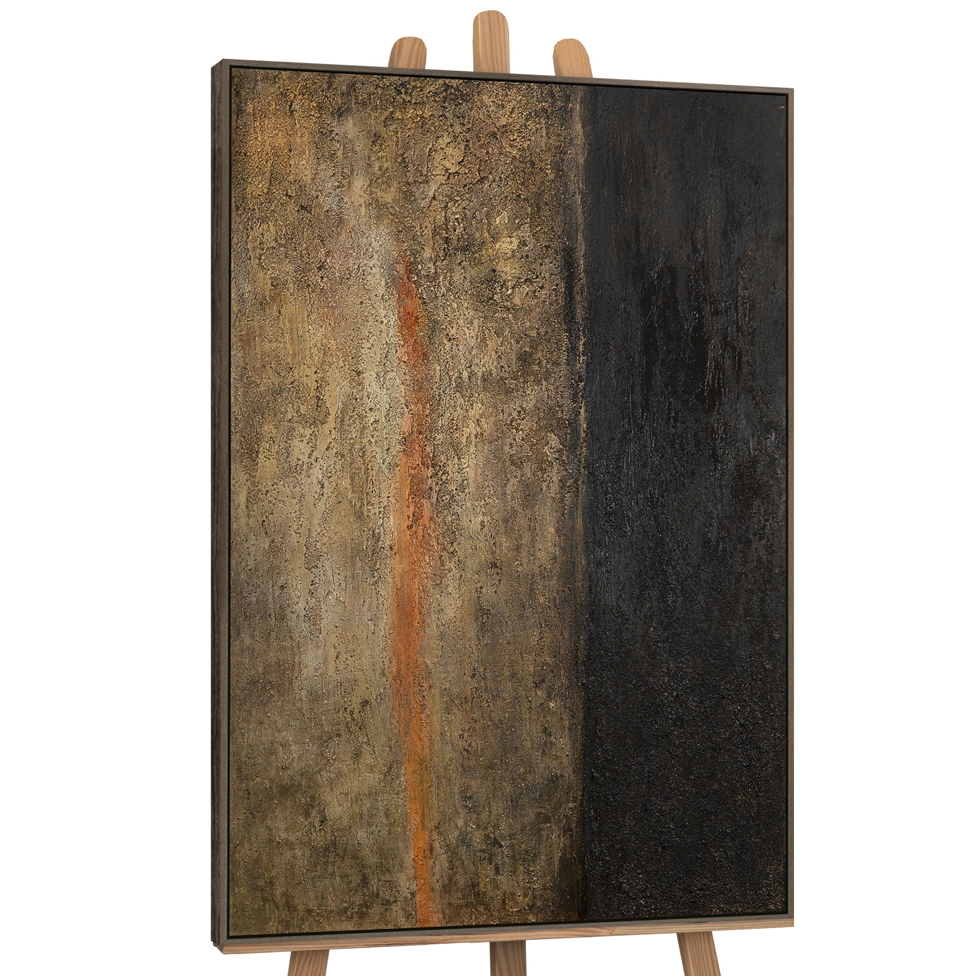 Ten obraz oddaje poczucie wieczności i niepojętego upływu czasu. Kontrastowa kompozycja łączy ciepłe złoto-brązowe odcienie z głęboką czernią, tworząc obraz tajemniczej ściany historii. Pionowy akcent w odcieniach ochry wzmacnia wrażenie ruchu i symbolizuje promień światła pośród ciemności.