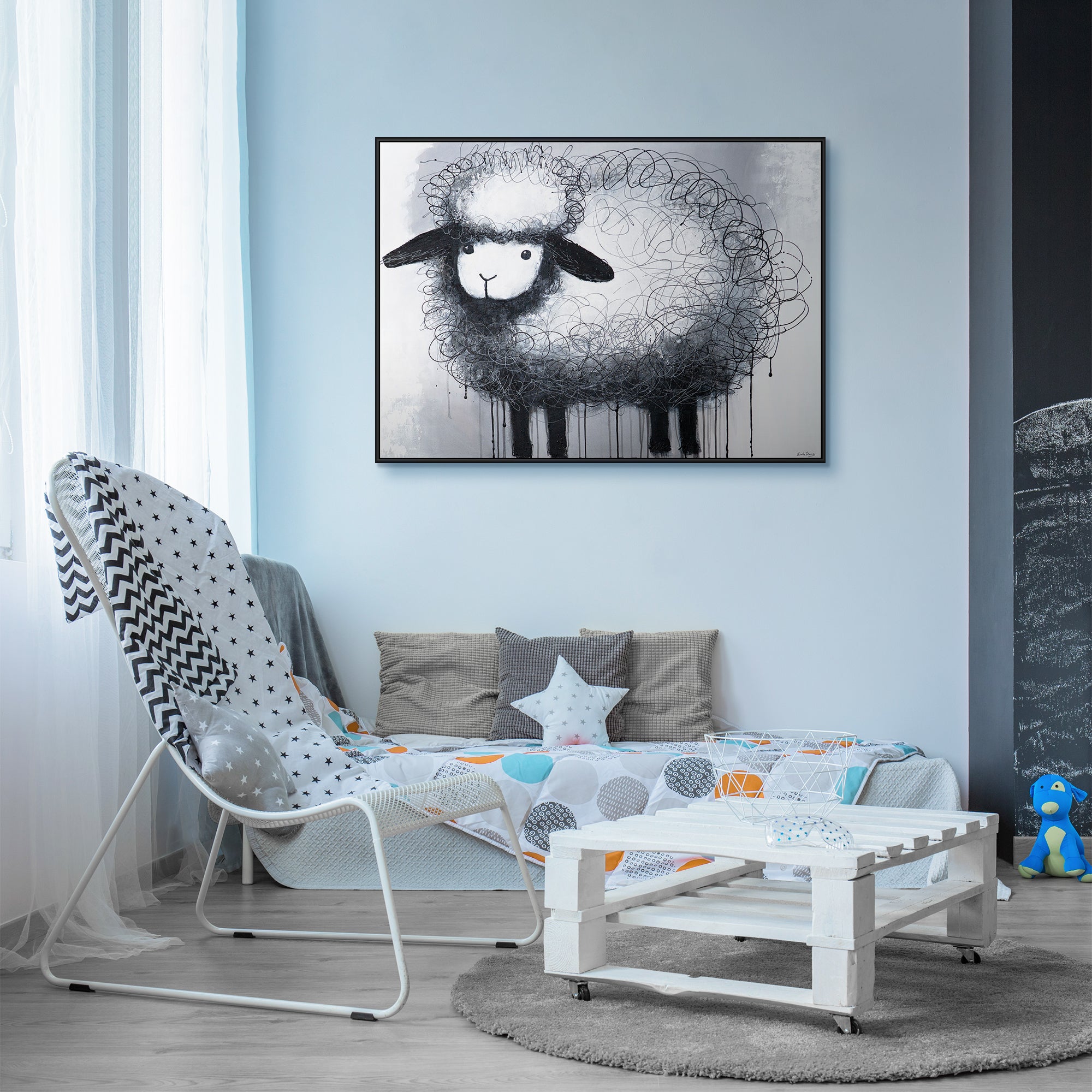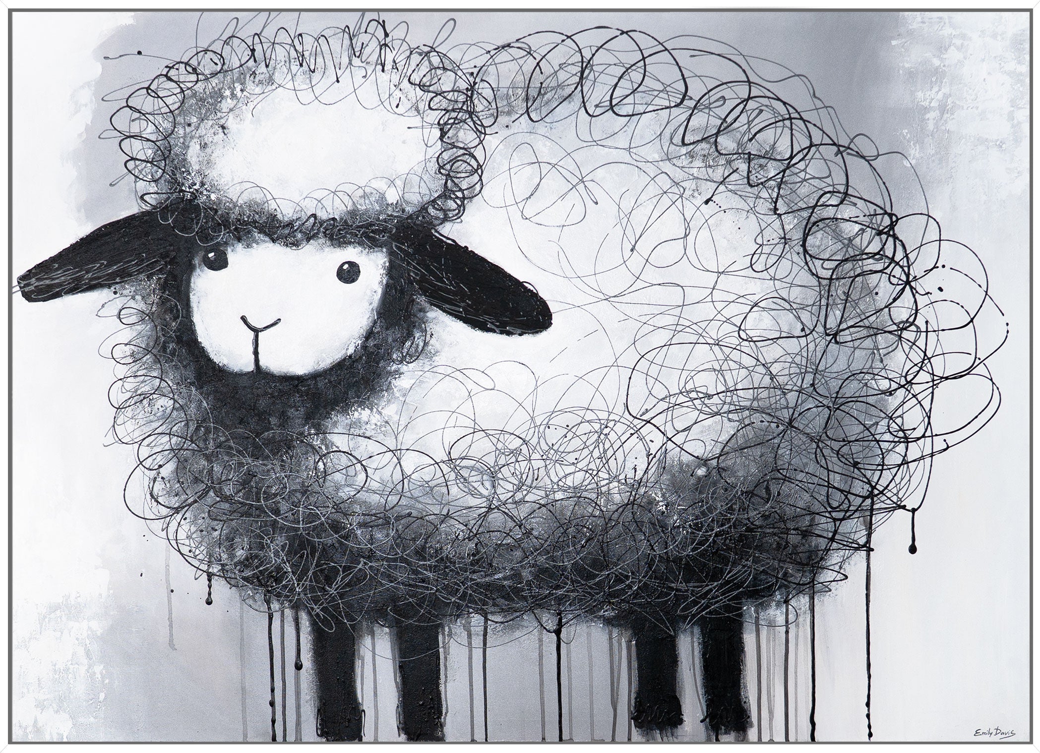 Uroczy wizerunek owcy z chaotycznymi, zabawnymi lokami wełny, wykonany w monochromatycznej gamie, tworzy wrażenie lekkości i dziecięcej beztroski. Prosty wyraz pyska wywołuje uśmiech, a dekoracyjna spontaniczność linii dodaje dynamiki i uroku.