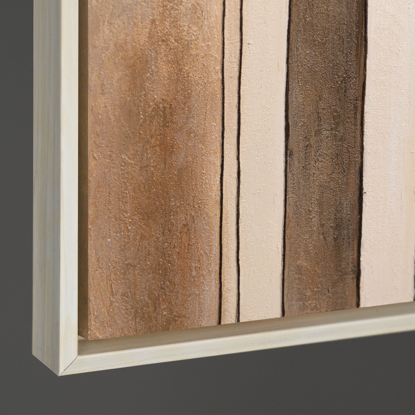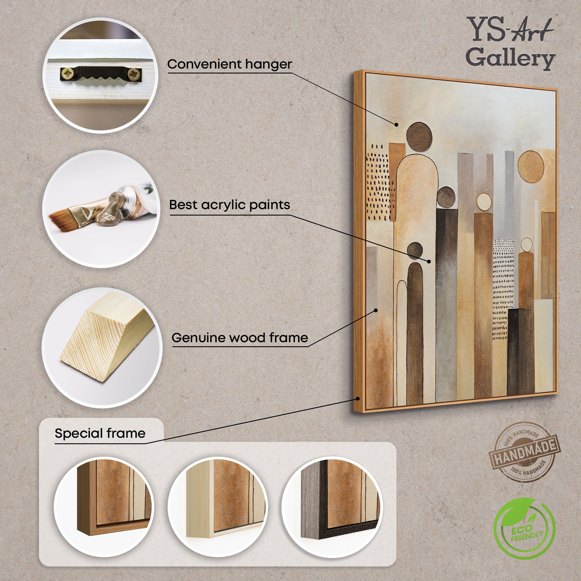 „Miasto figur” to połączenie rytmu architektonicznego i ludzkich sylwetek, sprowadzonych do prostych form i linii. Delikatne beżowo-brązowe odcienie tworzą wrażenie ciepła, stabilności i harmonii, a pionowe sylwetki przypominają miejski krajobraz pełen spokoju i światła. Obraz wydaje się odzwierciedlać życie wielkiego miasta, gdzie każda postać to osobna historia.