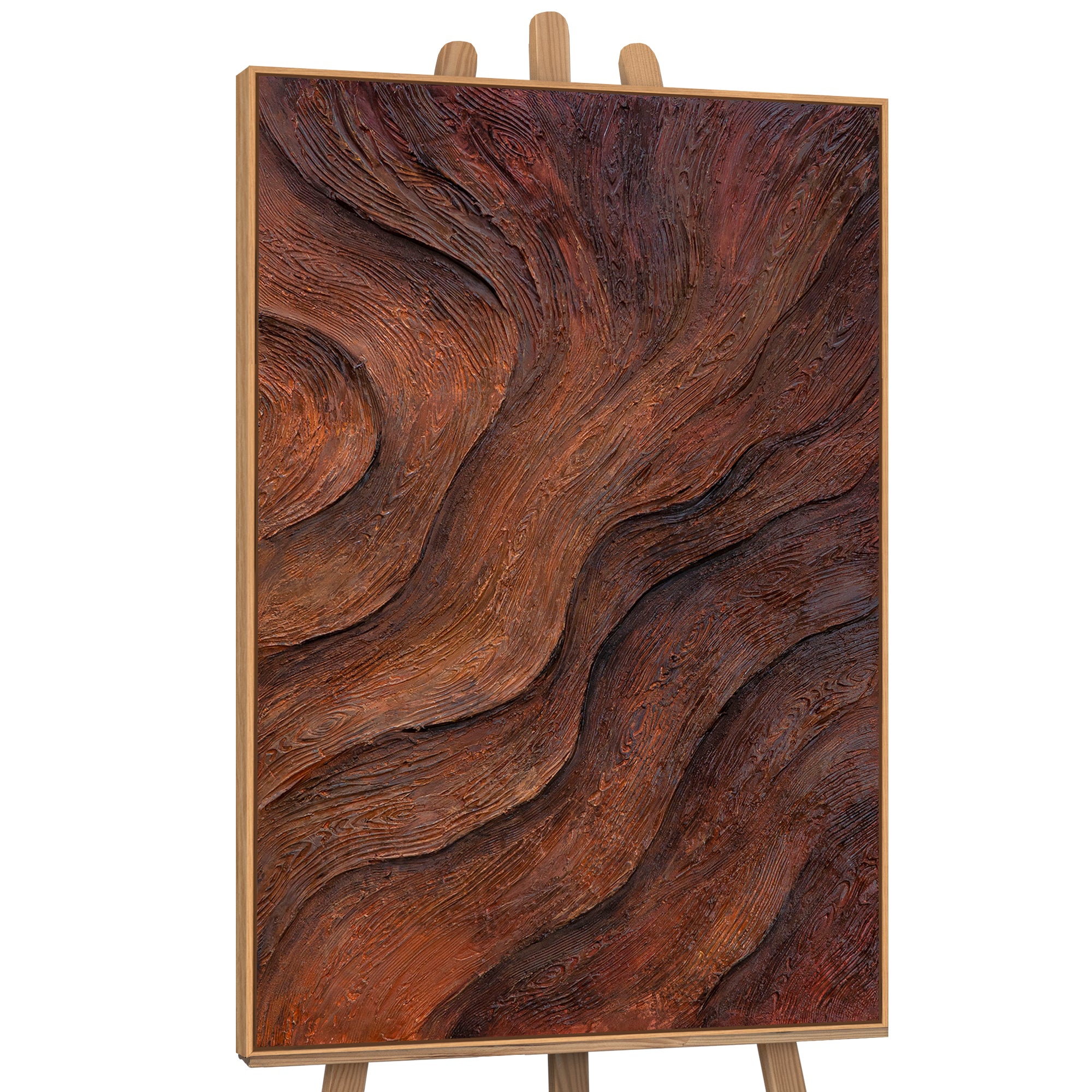 „Oddech drzewa” to ucieleśnienie naturalnej siły i ciepła, które żyje w samym sercu drzewa. Głębokie, reliefowe linie tworzą wrażenie ruchu i żywej energii, jakby sama natura oddychała przez fakturę płótna. Połączenie nasyconych odcieni brązu, terakoty i bursztynu tworzy głębię i ciepło, które wypełniają przestrzeń naturalną harmonią.