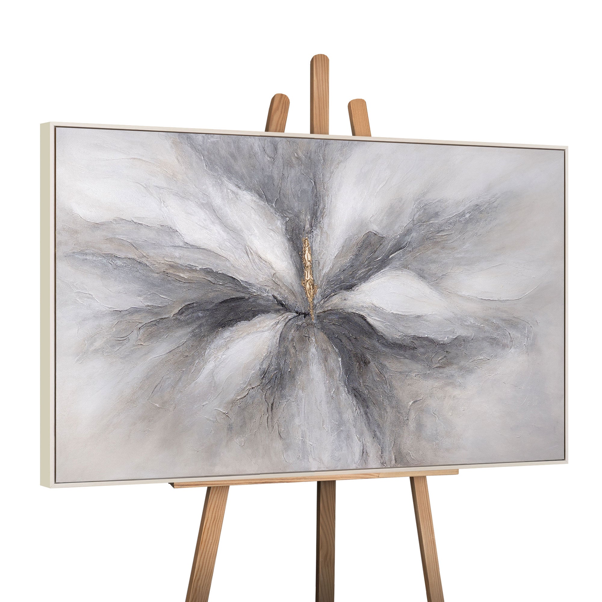 Ten obraz emanuje powściągliwą siłą i elegancją. Dynamiczne pociągnięcia pędzla w odcieniach szarości, bieli i srebra łączą się w jedną kompozycję, tworząc wrażenie wybuchu energii. Centralny złoty akcent podkreśla głębię płótna, dodając mu wyrafinowanego blasku i akcentu.
