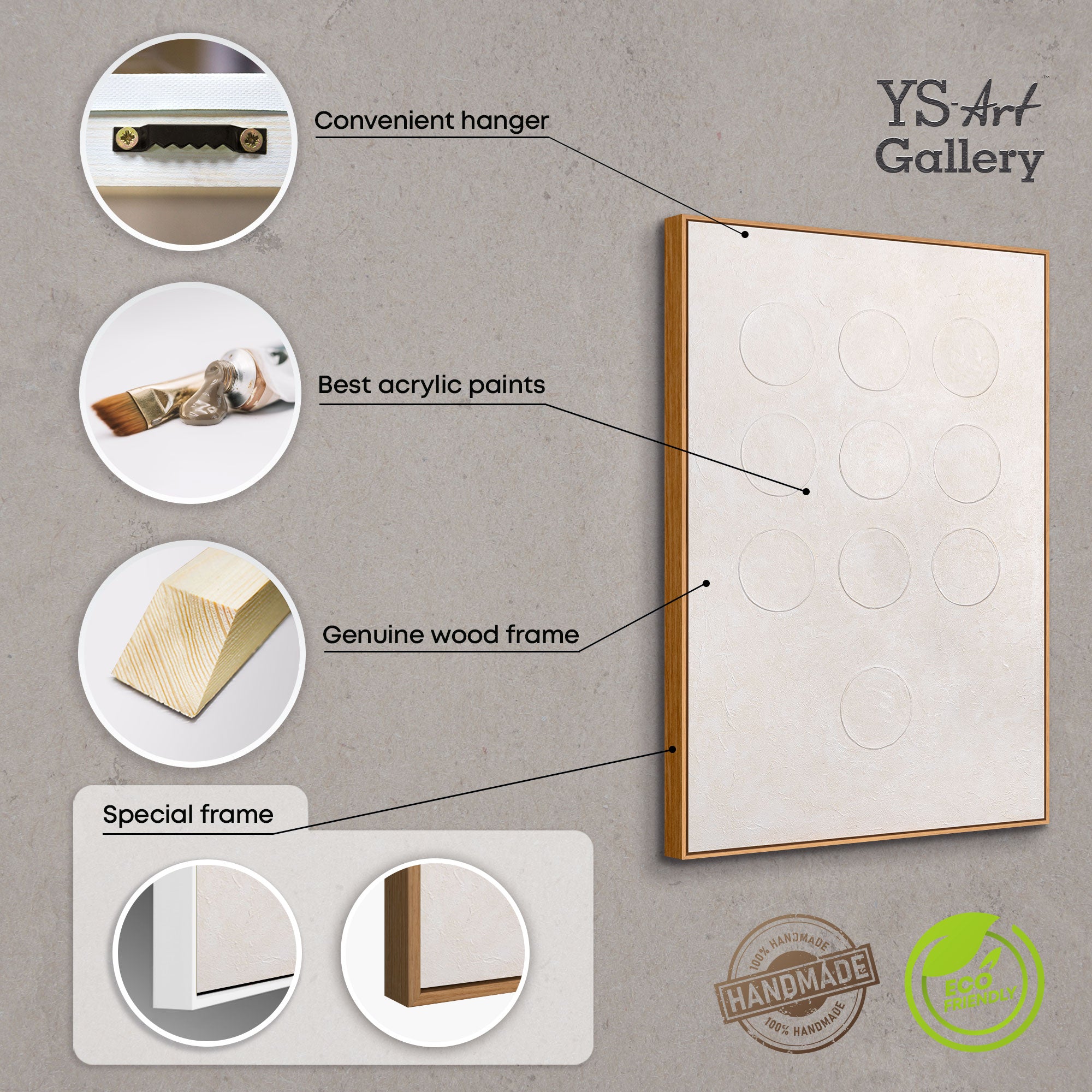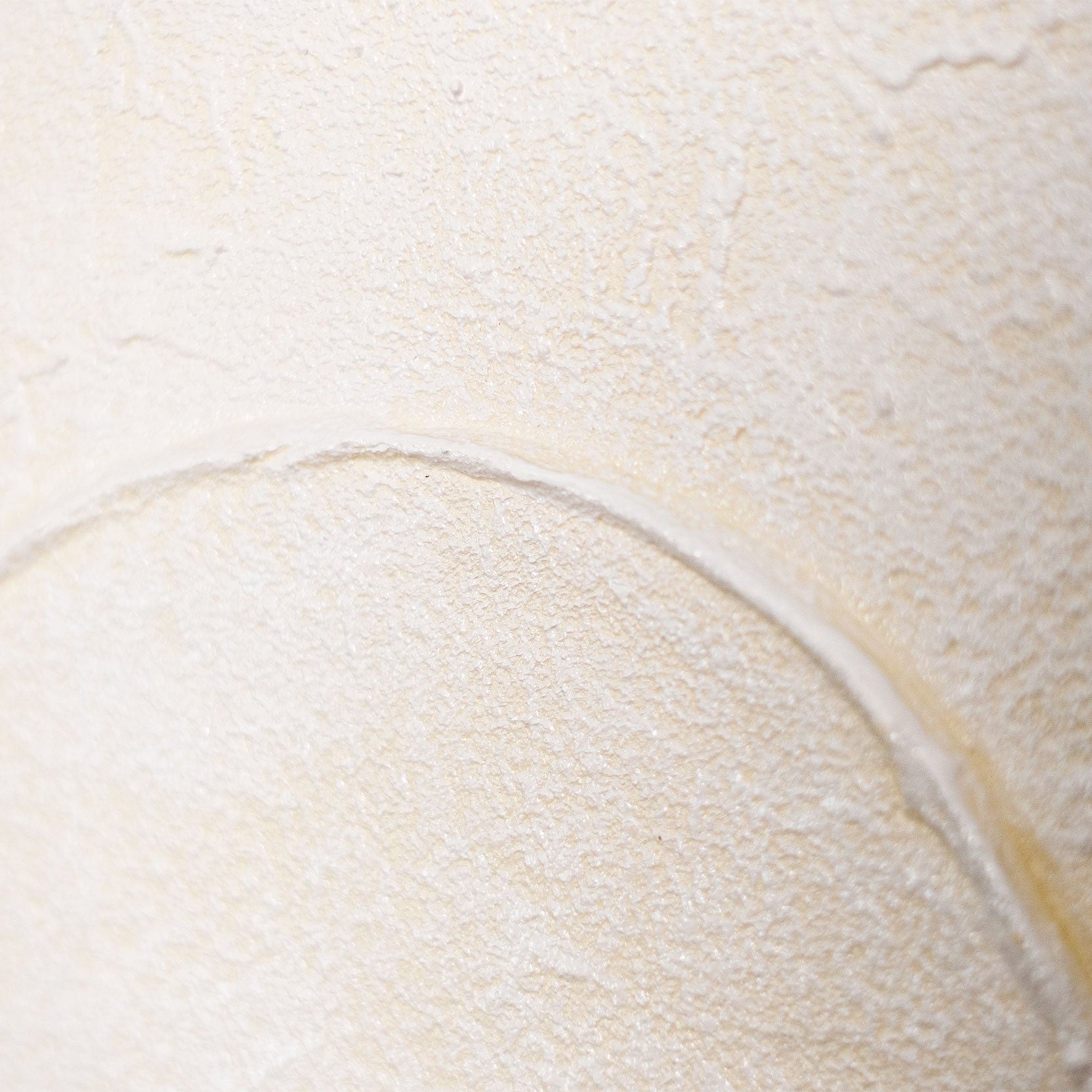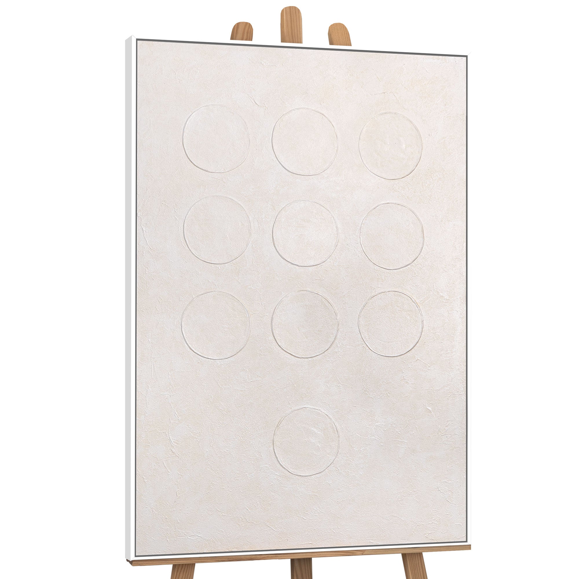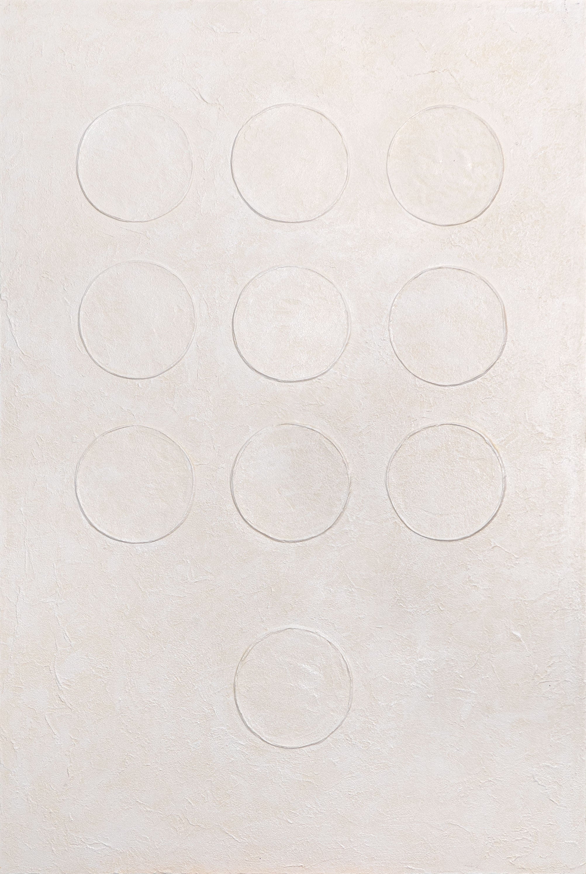 „Biały kod” to ucieleśnienie ciszy i czystości. Dziewięć reliefowych okręgów wyrzeźbionych w miękkiej fakturze płótna tworzy wrażenie porządku, harmonii i spokoju. Światło, grając na powierzchni, zmienia postrzeganie objętości, przekształcając prostą formę w medytacyjną kompozycję.