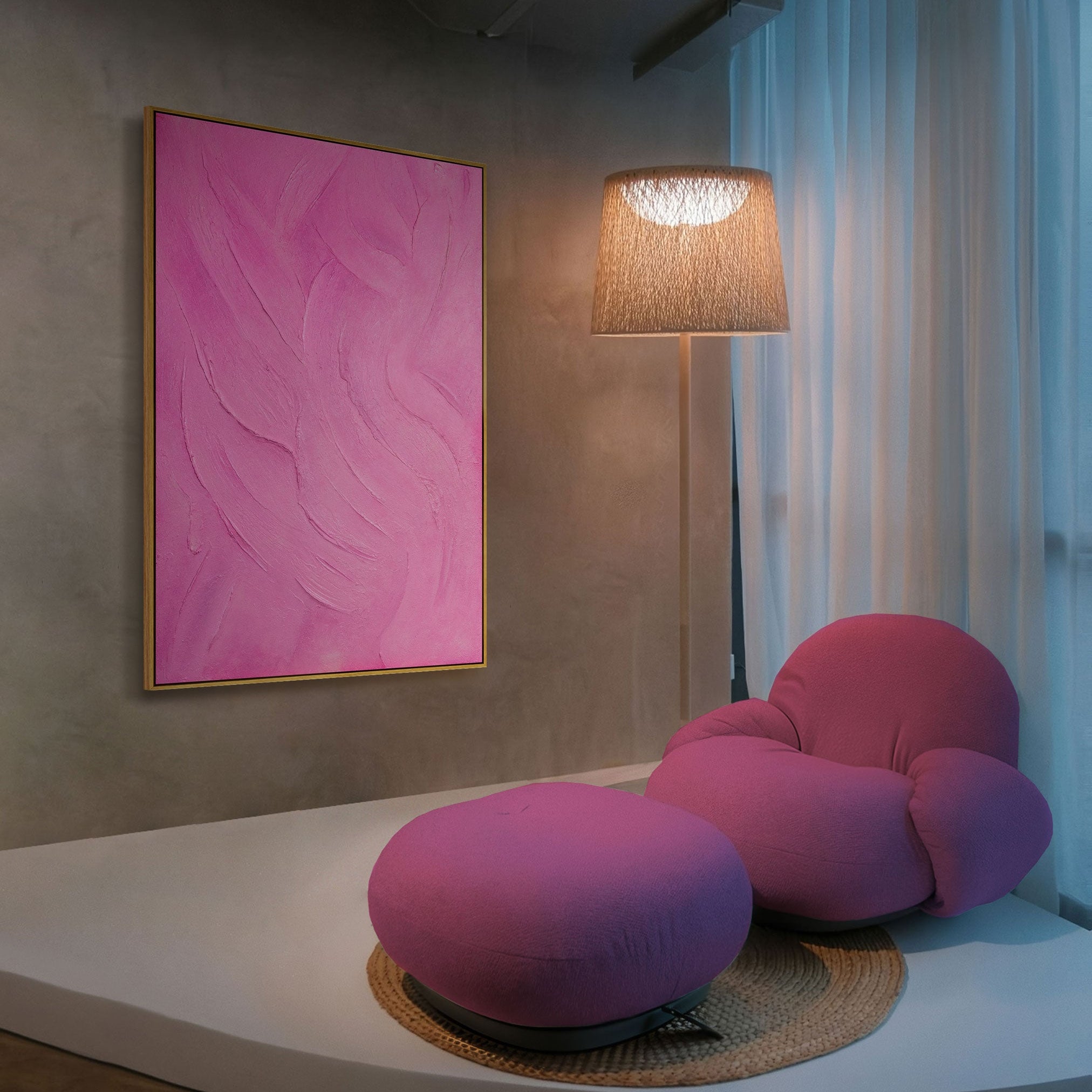 „Cukrowa zasłona” to ekspresyjna abstrakcja, pełna delikatności i energii. Ciepły różowy kolor z delikatnymi falistymi reliefami tworzy efekt lekkości i radości. Obraz jakby oddycha światłem, zmieniając przestrzeń w ciepłą i inspirującą.