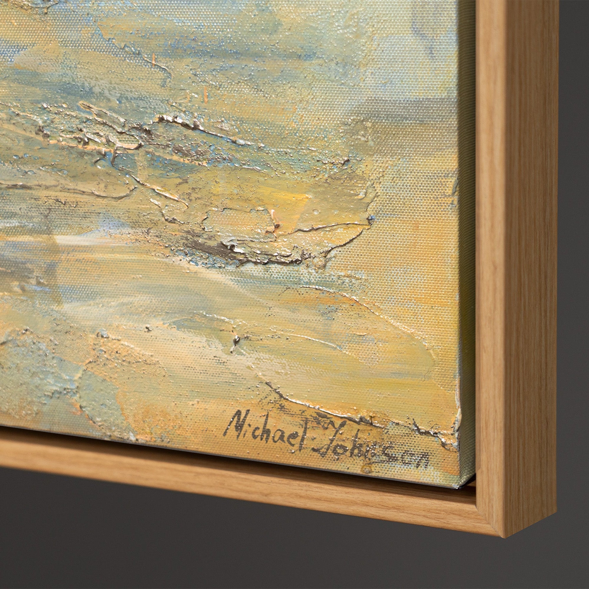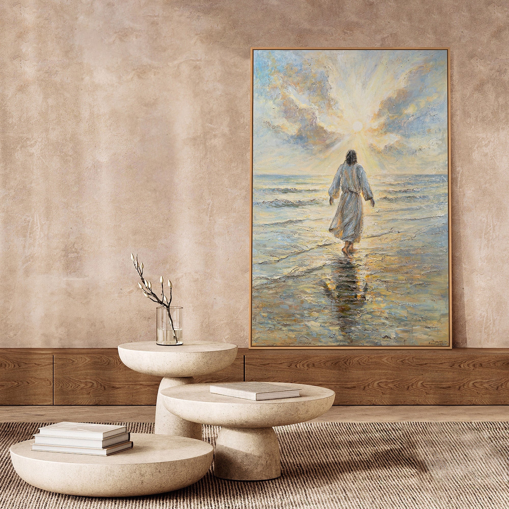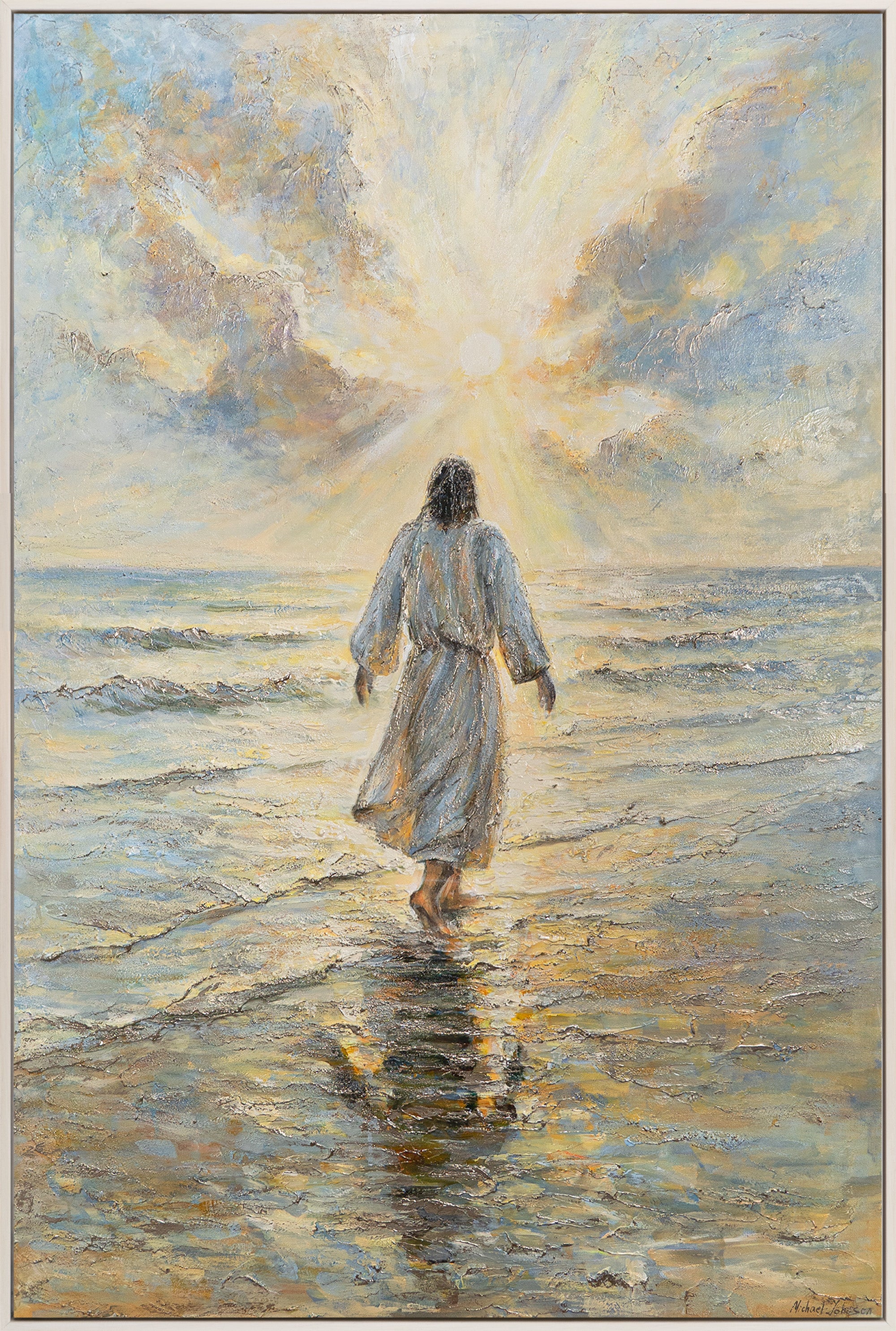 „Droga do światła” — obraz oddający atmosferę spokoju i duchowego uniesienia. Mężczyzna idący po wodzie w promieniach słońca, otoczony niebem i morzem, tworzy wrażenie nieskończoności i połączenia z siłami wyższymi. Ciepłe odcienie złota i błękitu podkreślają głębię chwili, a teksturowane płótno dodaje obrazowi głębi i emocjonalnej intensywności.