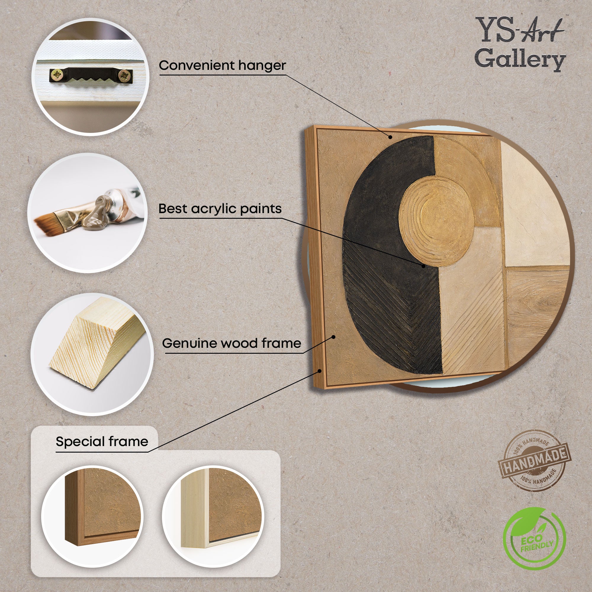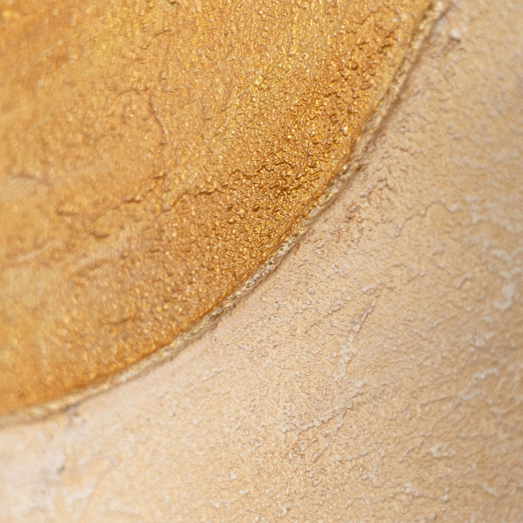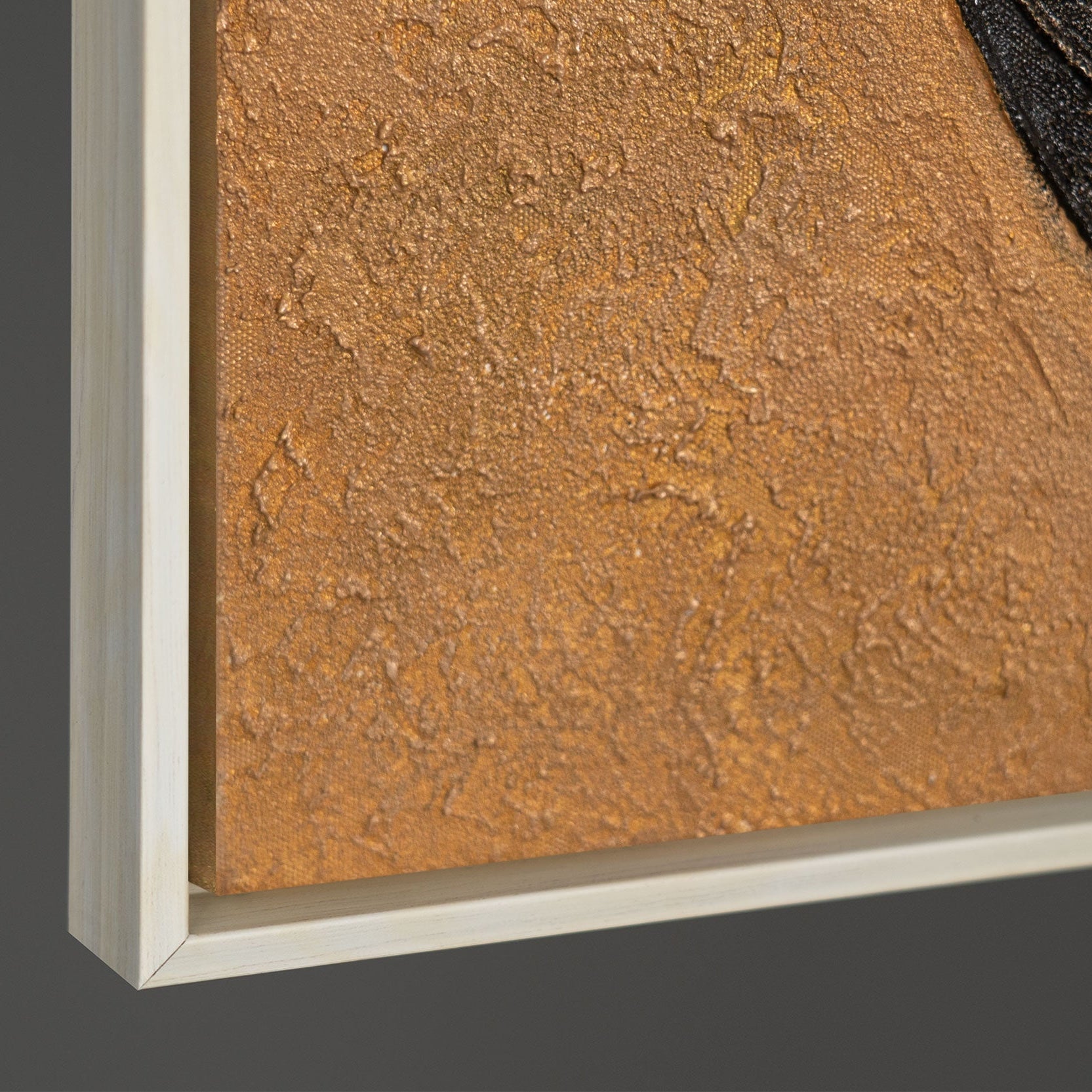 „Forma i faktura” to gra kontrastów, w której surowość geometrii łączy się z żywą materialnością powierzchni. Czarne półkole, złote płaszczyzny i ciepłe beżowo-piaskowe tekstury tworzą harmonię między stabilnością a ruchem. Obraz uosabia poczucie naturalnego rytmu i równowagi charakterystyczne dla współczesnej abstrakcji.