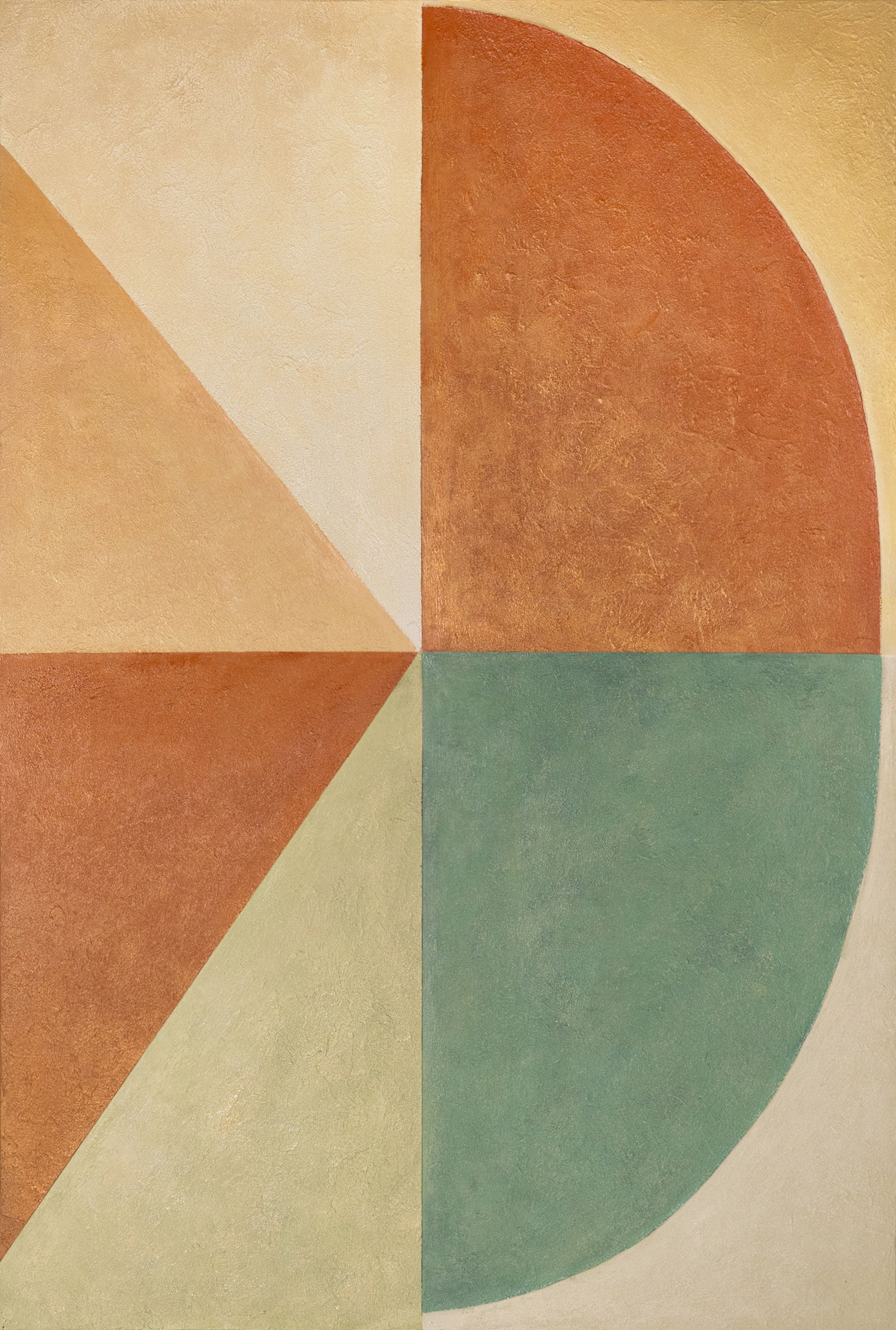„Formy w równowadze” to kompozycja geometryczna, w której spokojne, ciepłe kolory łączą się z miękkimi liniami i wyraźną symetrią. Połączenie odcieni pomarańczowego, zielonego i beżowego tworzy harmonijny kontrast, który oddaje ideę równowagi i naturalnego ruchu. Obraz emanuje poczuciem stabilności i wewnętrznego spokoju.