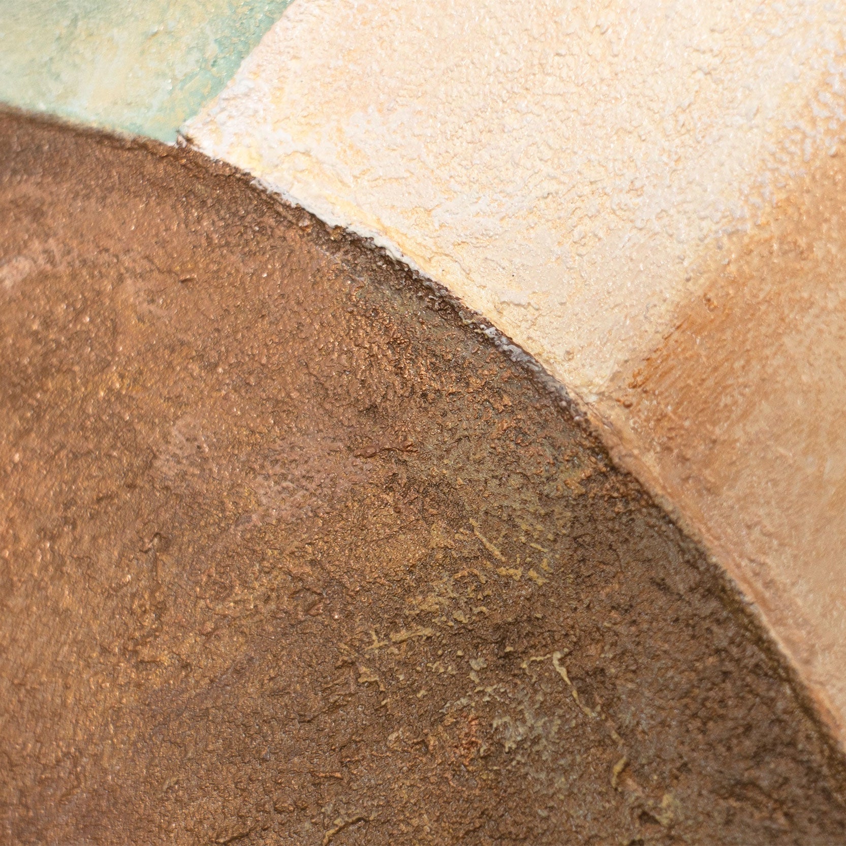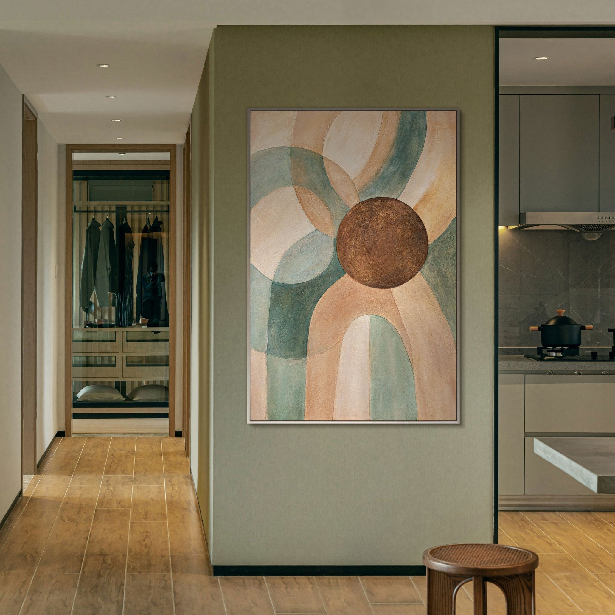 „Krąg życia” to filozoficzna abstrakcja łącząca miękkie linie i kojące odcienie zieleni, beżu i brązu. Centralny krąg symbolizuje jedność, ciągłość i naturalny rytm istnienia. Przeplatanie się form tworzy wizualny ruch, niczym oddech natury, pełen harmonii i spokoju.