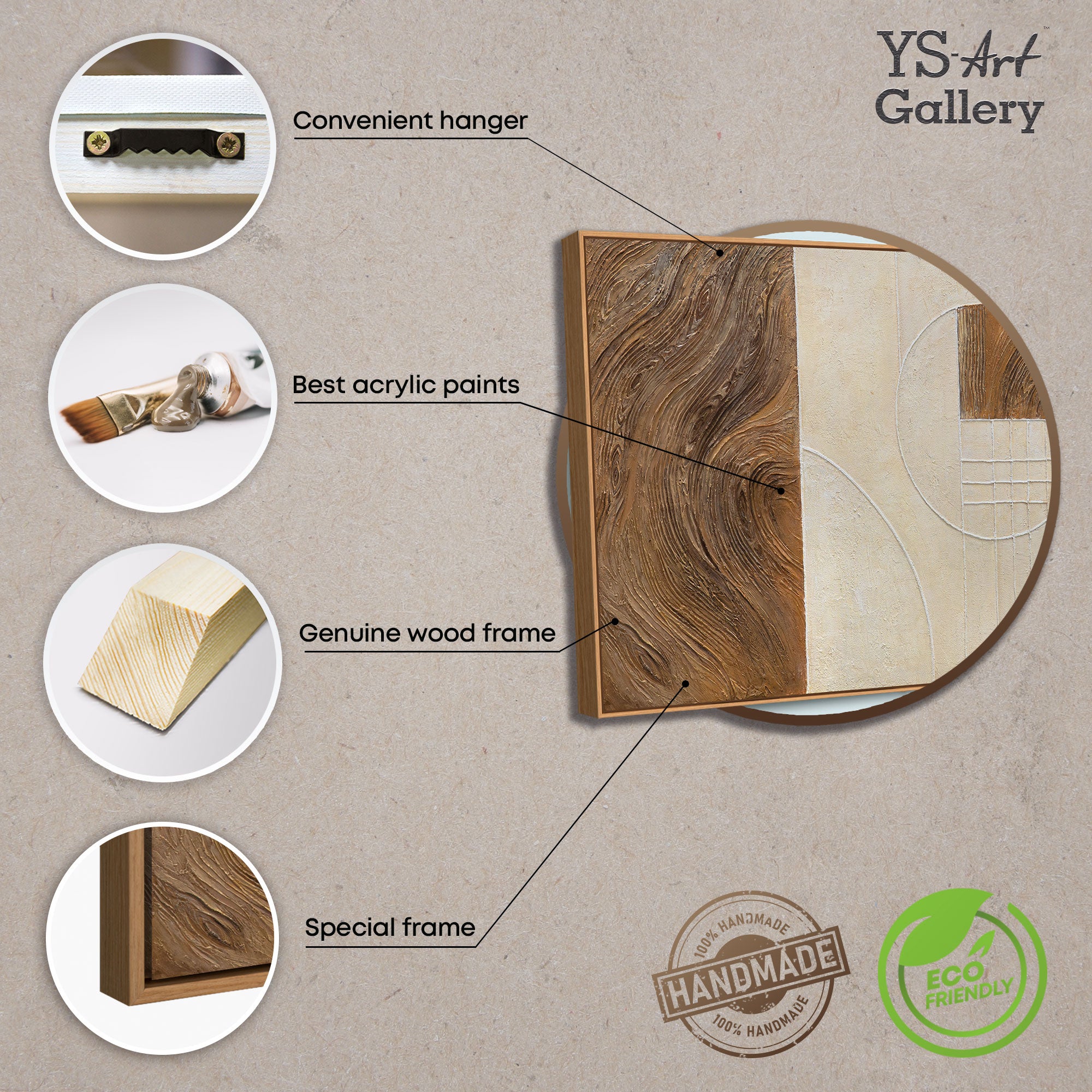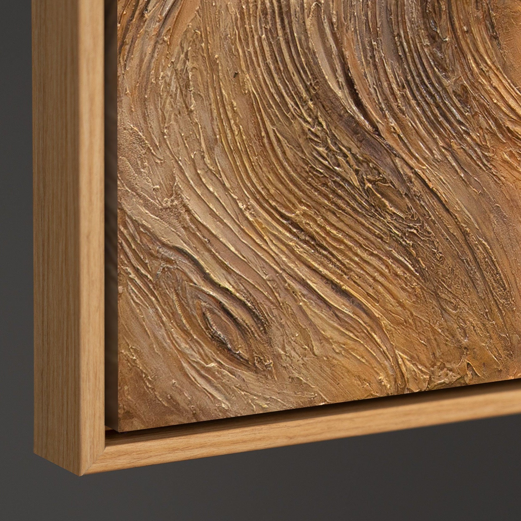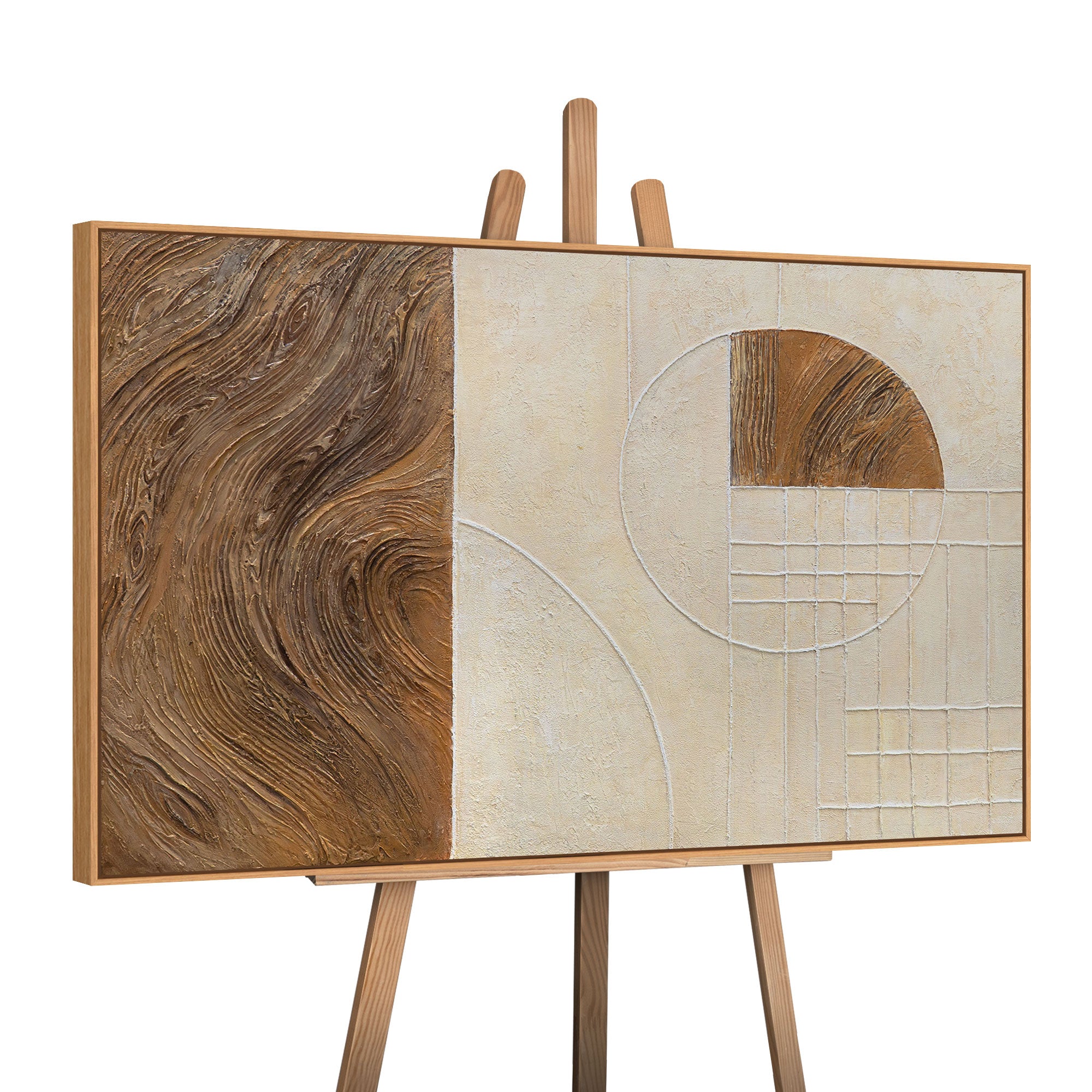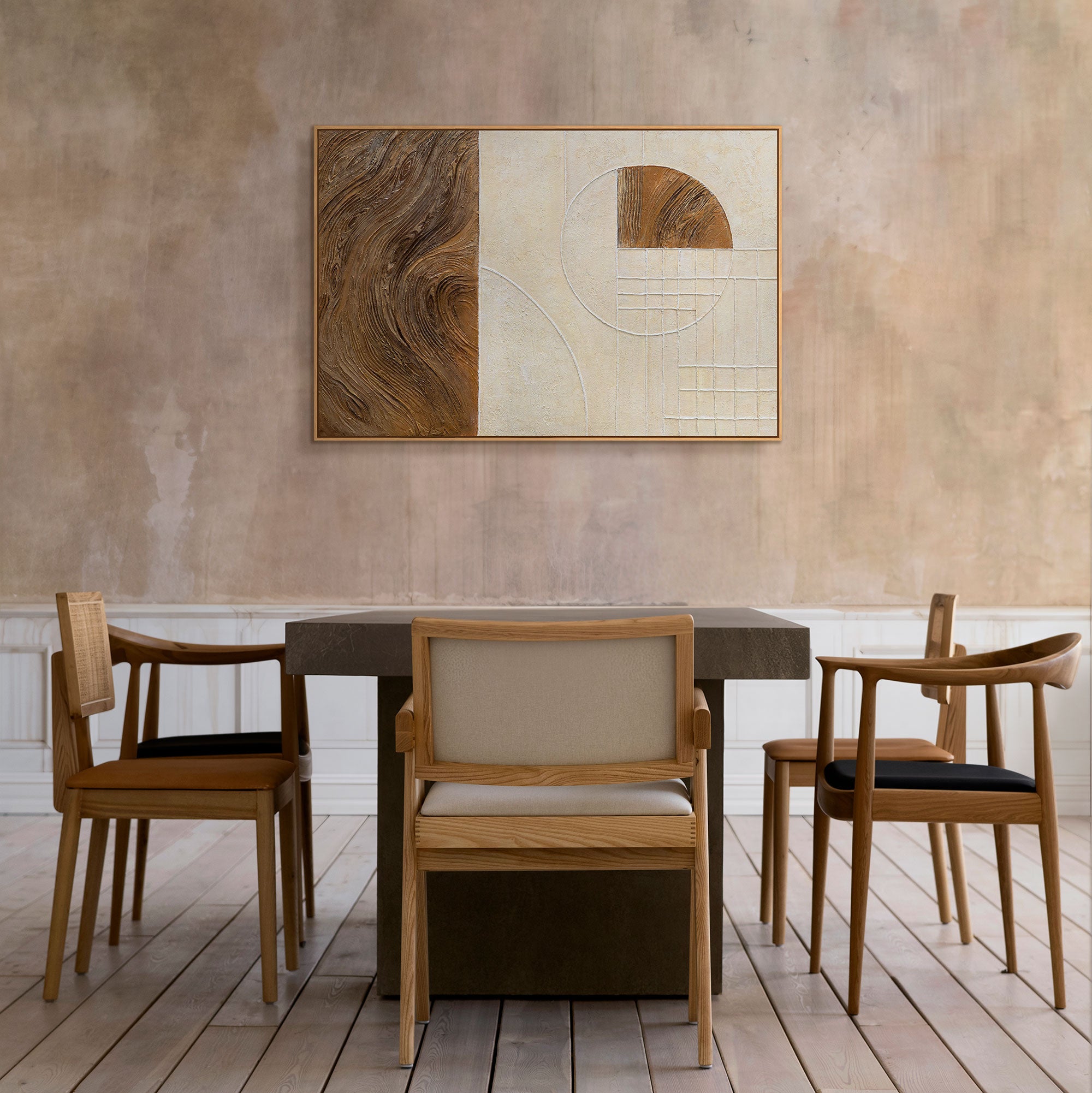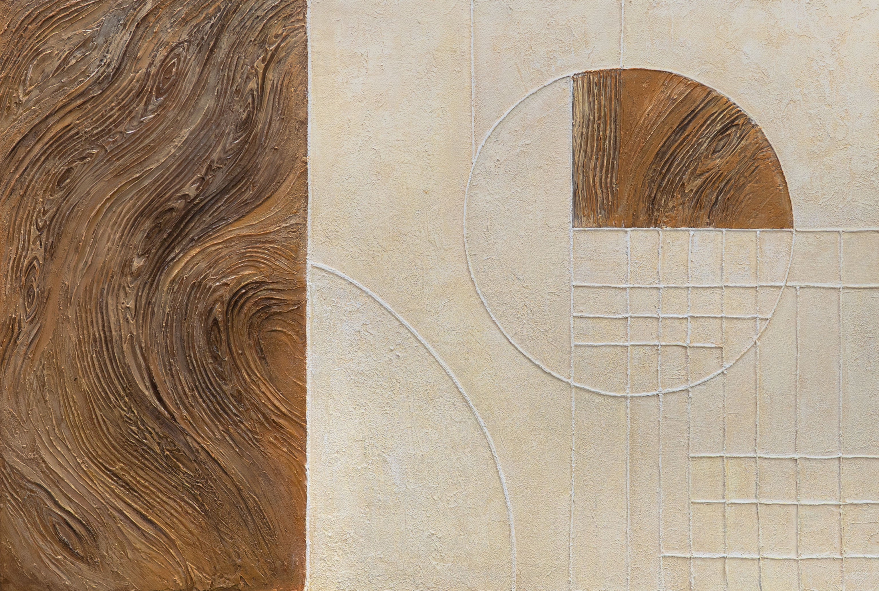 „Linie i koło” to połączenie naturalnej faktury drewna i architektonicznej precyzji formy. Obraz łączy dwie żywioły — organiczność i porządek. Lewa część płótna oddaje ruch i ciepło drzewnych fal, natomiast prawa — tworzy równowagę poprzez geometryczne struktury i minimalizm kolorów.