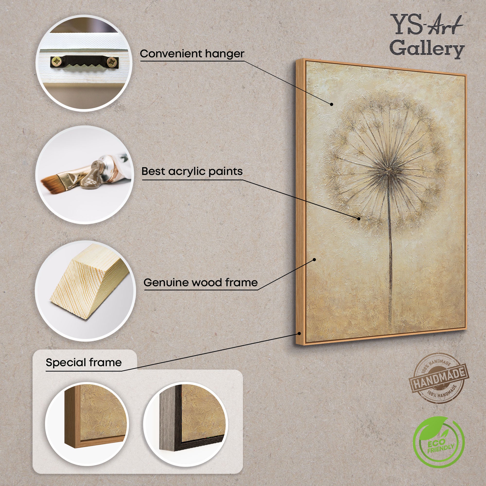 „Oddech lata” to wspomnienie ciepłego dnia, kiedy każdy oddech niesie zapach kwiatów i delikatne światło. Na płótnie przedstawiono delikatną dmuchawcę, wykonaną w delikatnej technice reliefowej. Jasne odcienie kremowego, złocistego i beżowego wypełniają kompozycję delikatnym blaskiem, tworząc wrażenie lekkości i spokoju.