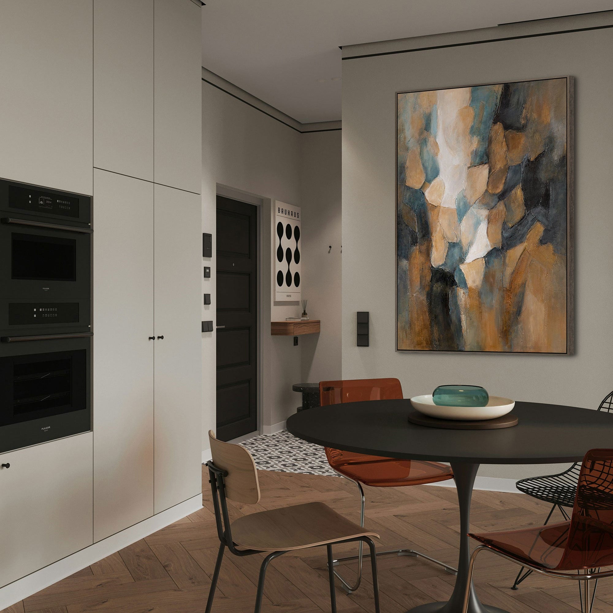 Obraz harmonijnie uzupełni nowoczesny wnętrze w stylu minimalistycznym, modernistycznym lub skandynawskim. Jego kolory tworzą atmosferę przytulności i wewnętrznej równowagi, wypełniając przestrzeń delikatnym światłem i harmonią.