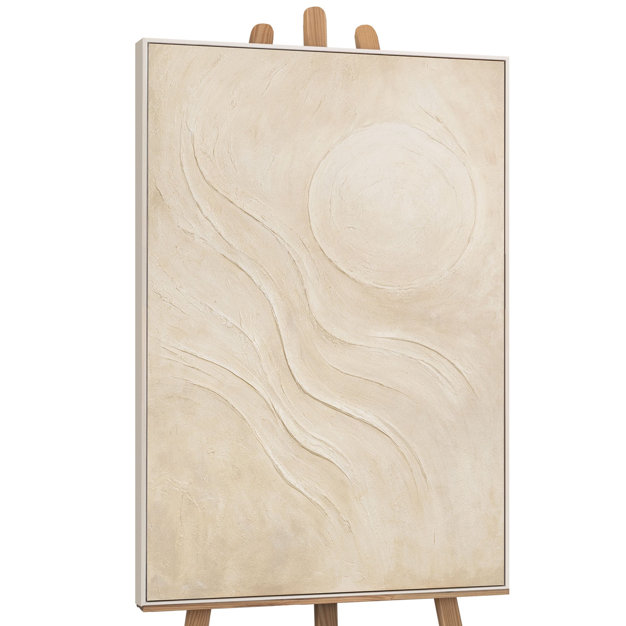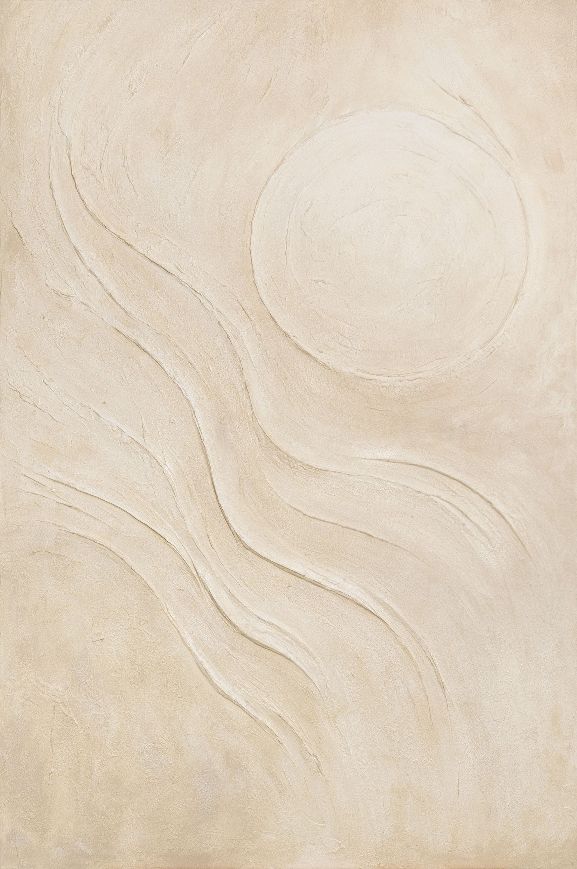 „Piaskowe słońce” emanuje spokojem i naturalną harmonią. Ciepłe odcienie beżu i piasku, płynnie przechodzące jeden w drugi, tworzą efekt światła rozlewającego się po powierzchni. Reliefowa faktura dodaje objętości i przypomina dotyk miękkiego piasku pod łagodnym słońcem.