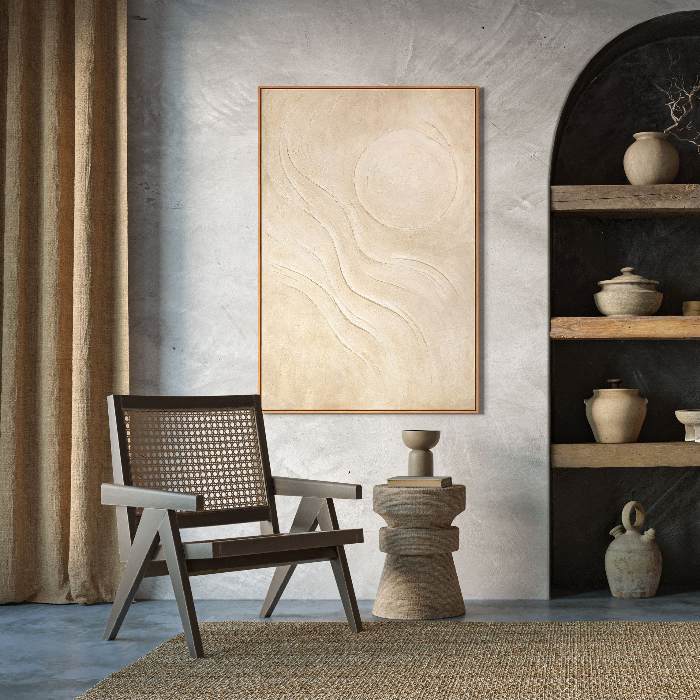 Ta praca idealnie pasuje do nowoczesnych wnętrz w stylu minimalistycznym, skandynawskim lub wabi-sabi. Wypełnia przestrzeń przytulnością i naturalną równowagą, tworząc atmosferę spokoju i ciepła.