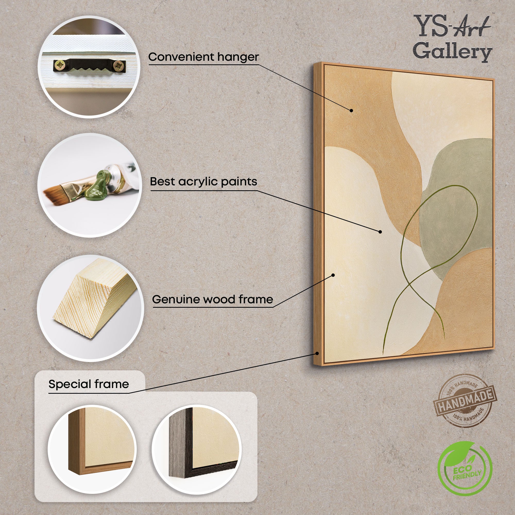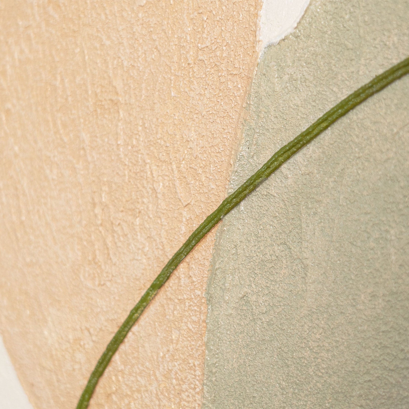 „Przeplatanie” to historia o wzajemnym oddziaływaniu form i rytmów natury. Delikatne beżowe, piaskowe i zielonkawe płaszczyzny płynnie przechodzą jedna w drugą, tworząc wrażenie naturalnego ruchu i harmonii. Cienka linia przebiegająca przez kompozycję dodaje obrazowi dynamiki i równowagi.