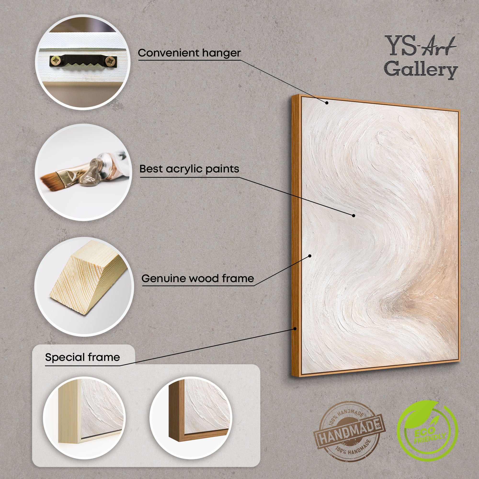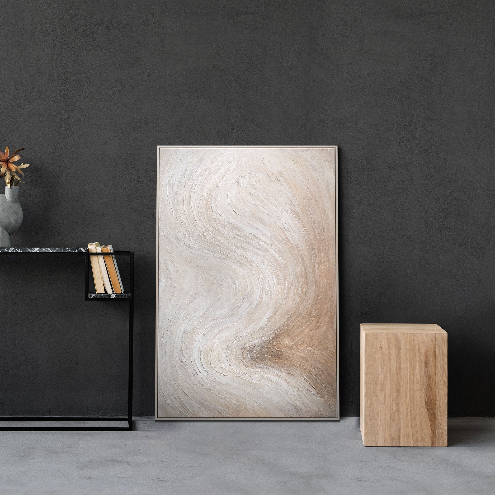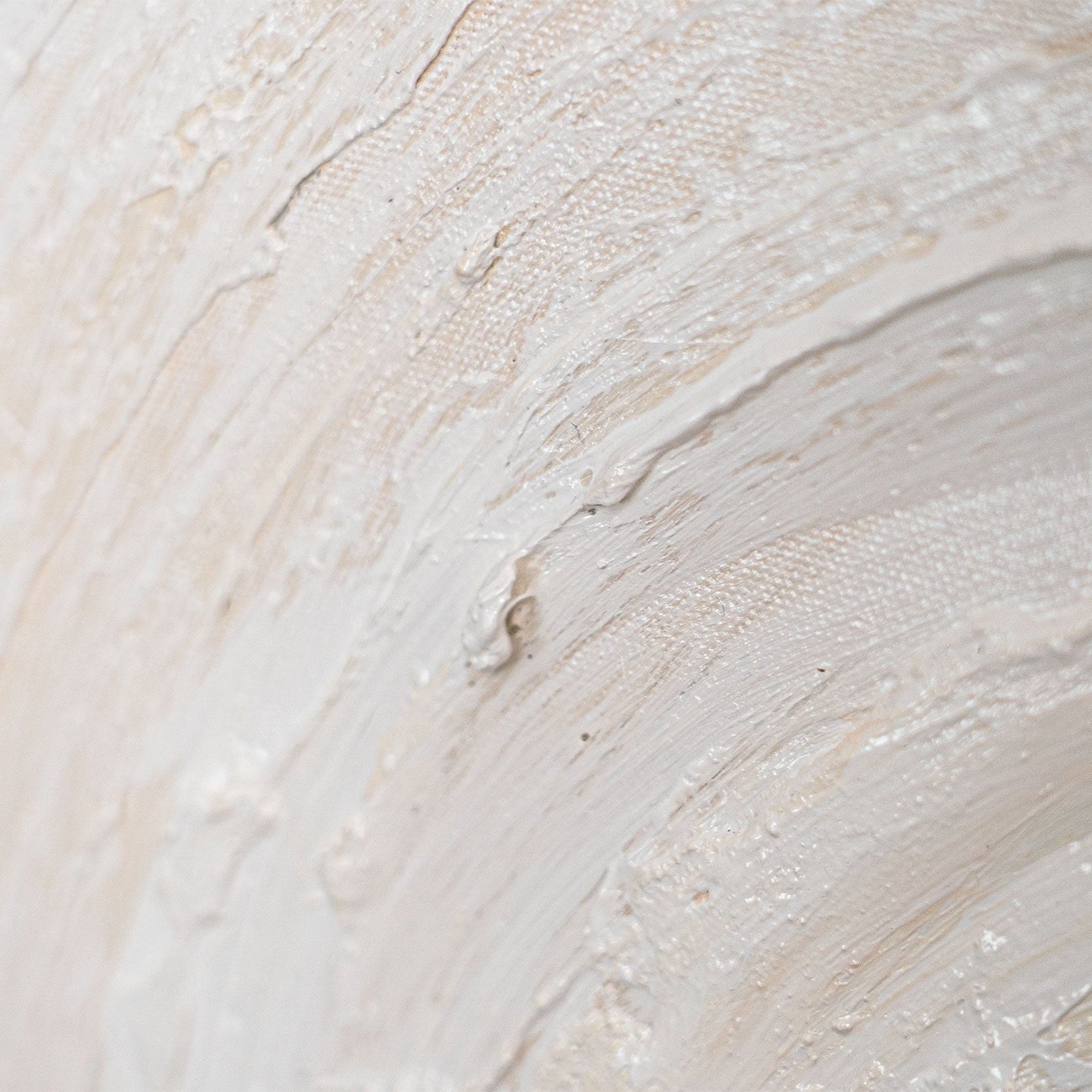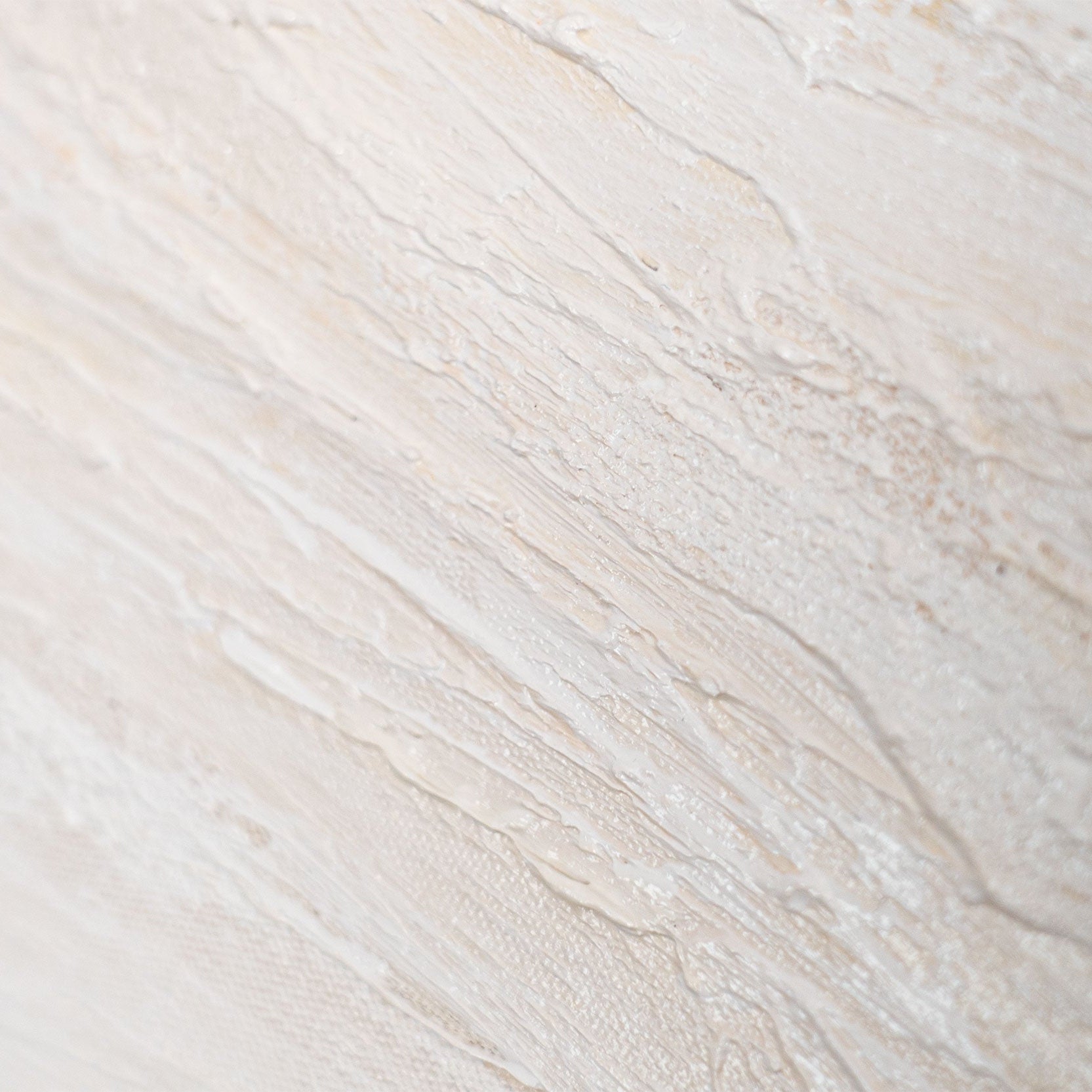 „Strumień światła” przekazuje delikatny przepływ energii w jasnych, naturalnych odcieniach. Miękkie pociągnięcia pędzla z płynnymi przejściami bieli, kremu i piaskowego koloru tworzą wrażenie lekkiego ruchu, jakby promień światła ślizgał się po powierzchni. Głęboka faktura podkreśla żywą materialność i nadaje płótnu szczególną harmonię.