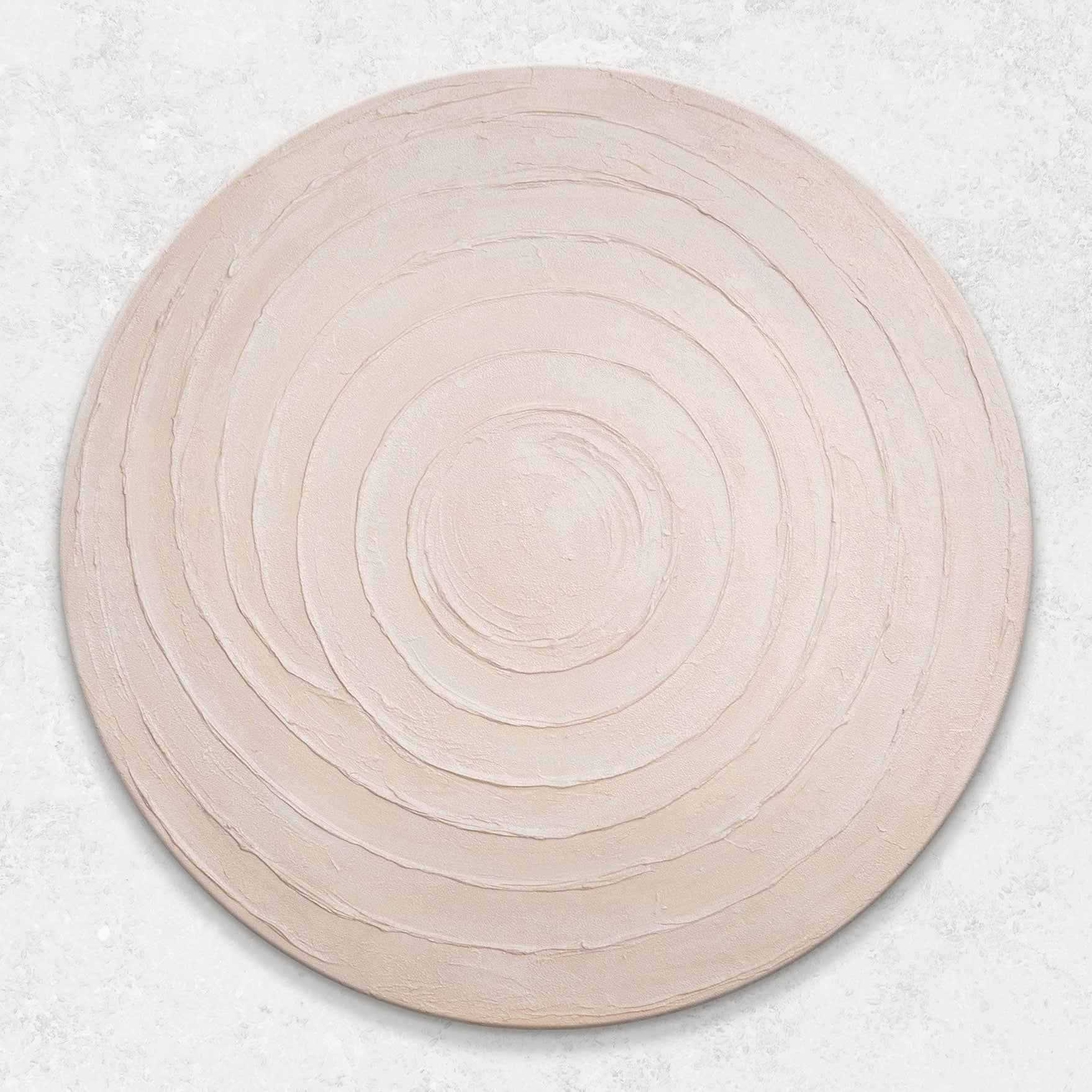„Rytm okrężny” to spokojna harmonia form, ucieleśniona w koncentrycznych liniach, które tworzą wrażenie ruchu i równowagi. Miękka faktura i jasnobeżowy kolor nadają płótnu naturalną lekkość, jakby czas rozlewał się po okręgu, pozostawiając delikatny wzór na powierzchni.
