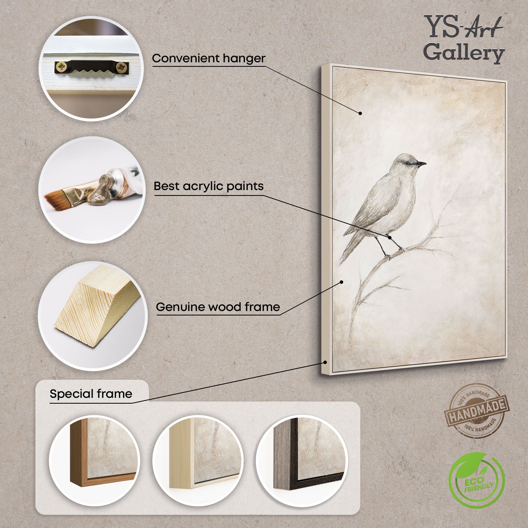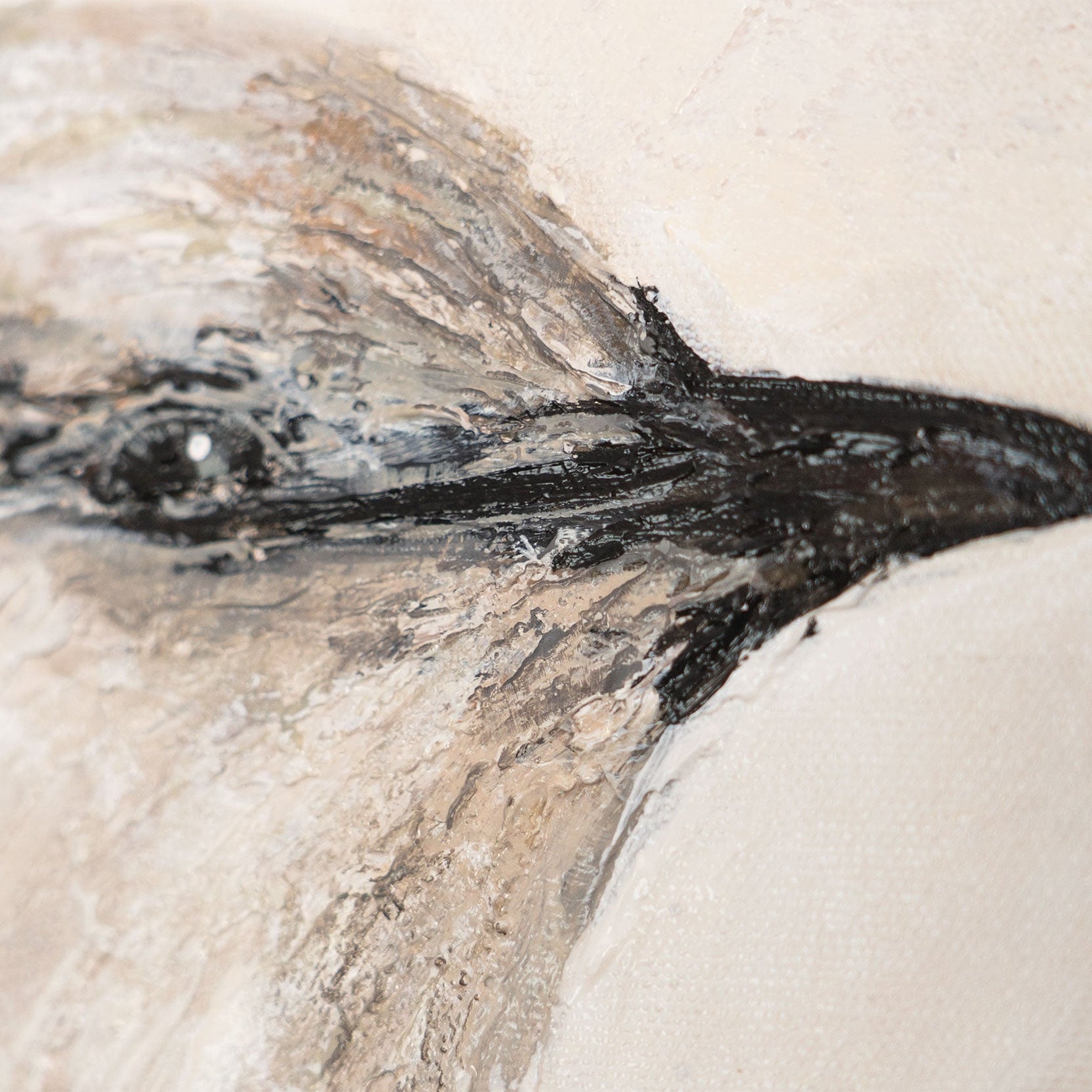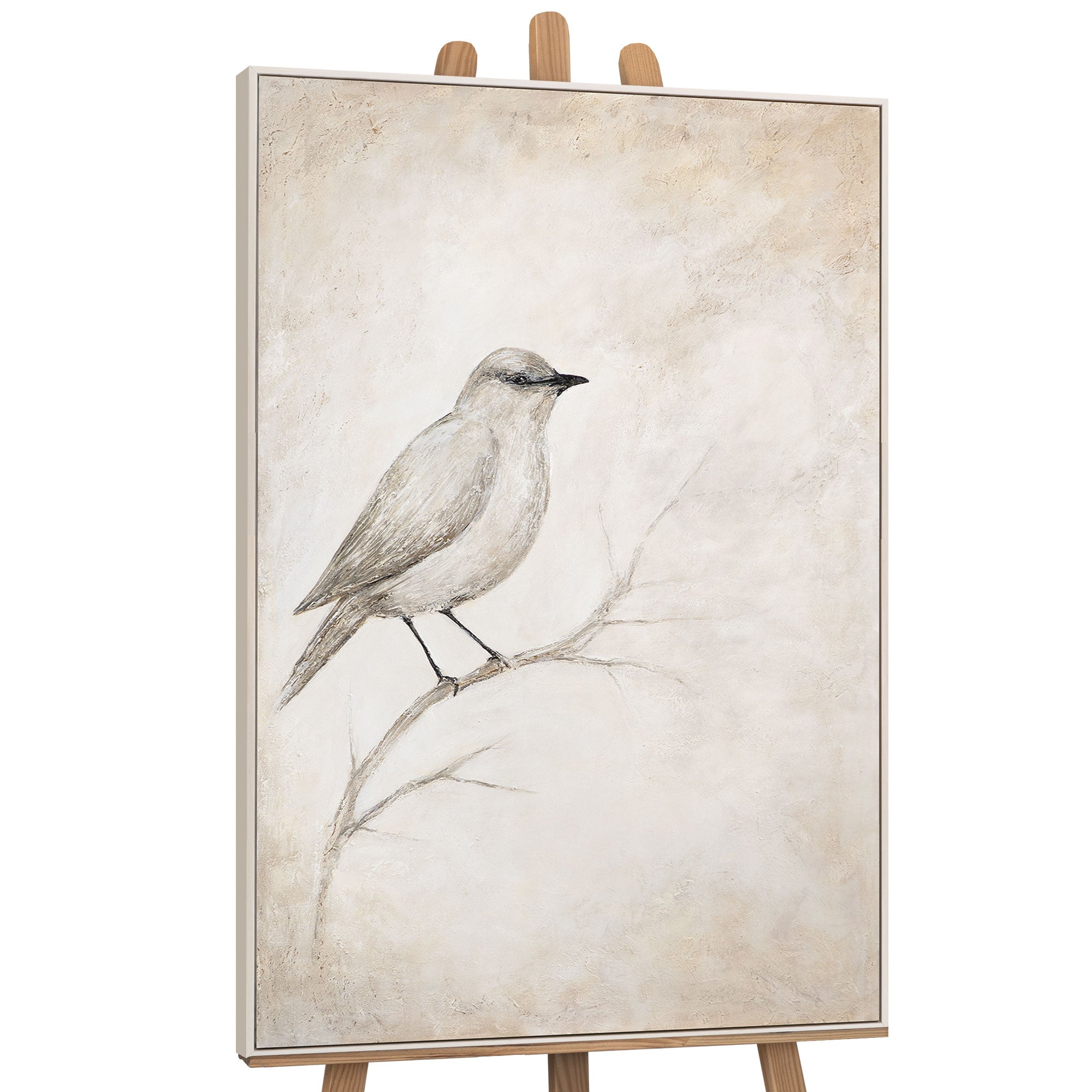 „Śpiewająca pauza” oddaje chwilę ciszy i skupionego spokoju. Na gałęzi zamarł ptak, jakby wsłuchiwając się we własny oddech. Delikatne przejścia kolorów i jasne beżowo-szare odcienie tworzą atmosferę harmonii i naturalnej lekkości. Obraz jest wypełniony światłem, które dodaje przestrzeni wrażenia powietrza i ciepła.