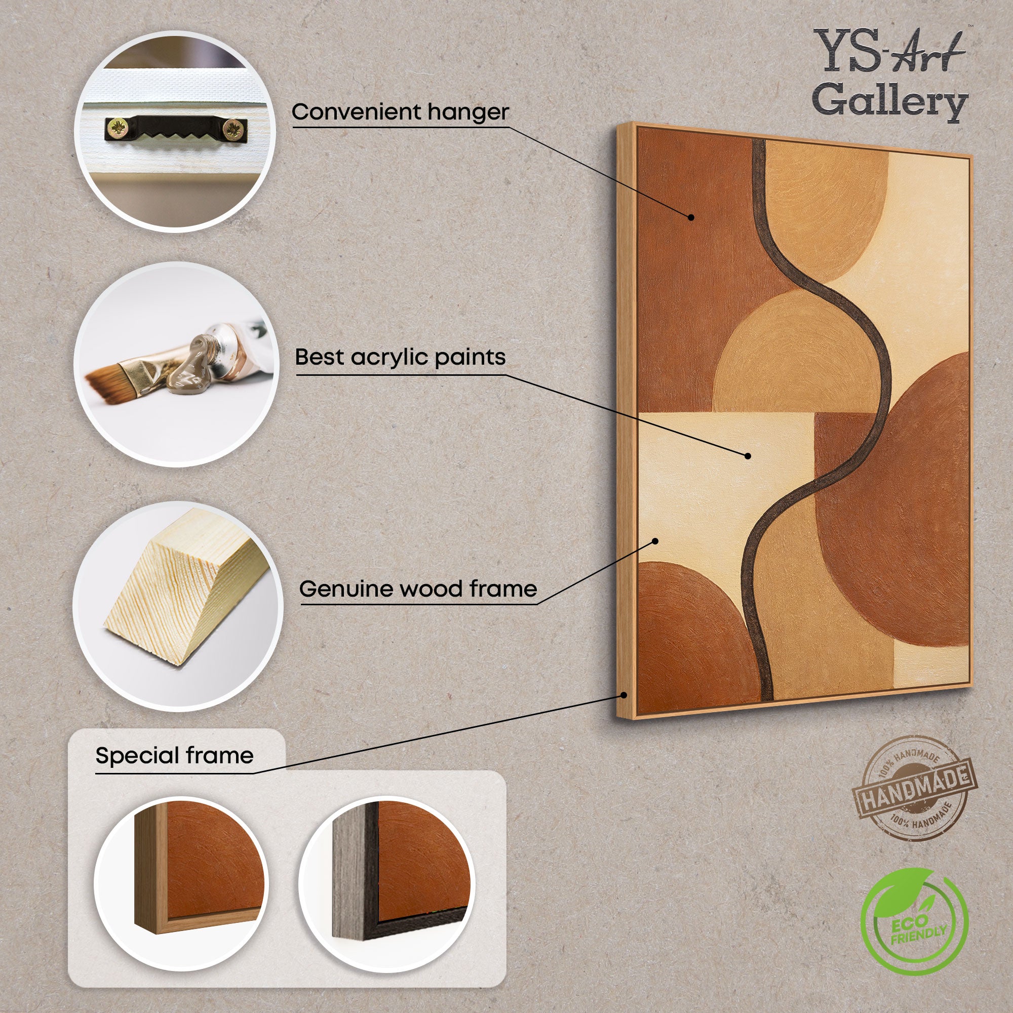 „Splecenie form” to subtelna gra linii i geometrycznych konturów w harmonijnej palecie odcieni ochry, brązu i beżu. Centralna falista linia dodaje kompozycji dynamiki, tworząc wizualny rytm i wrażenie naturalnego ruchu. Obraz łączy spokój i energię w jednej równowadze koloru i formy.