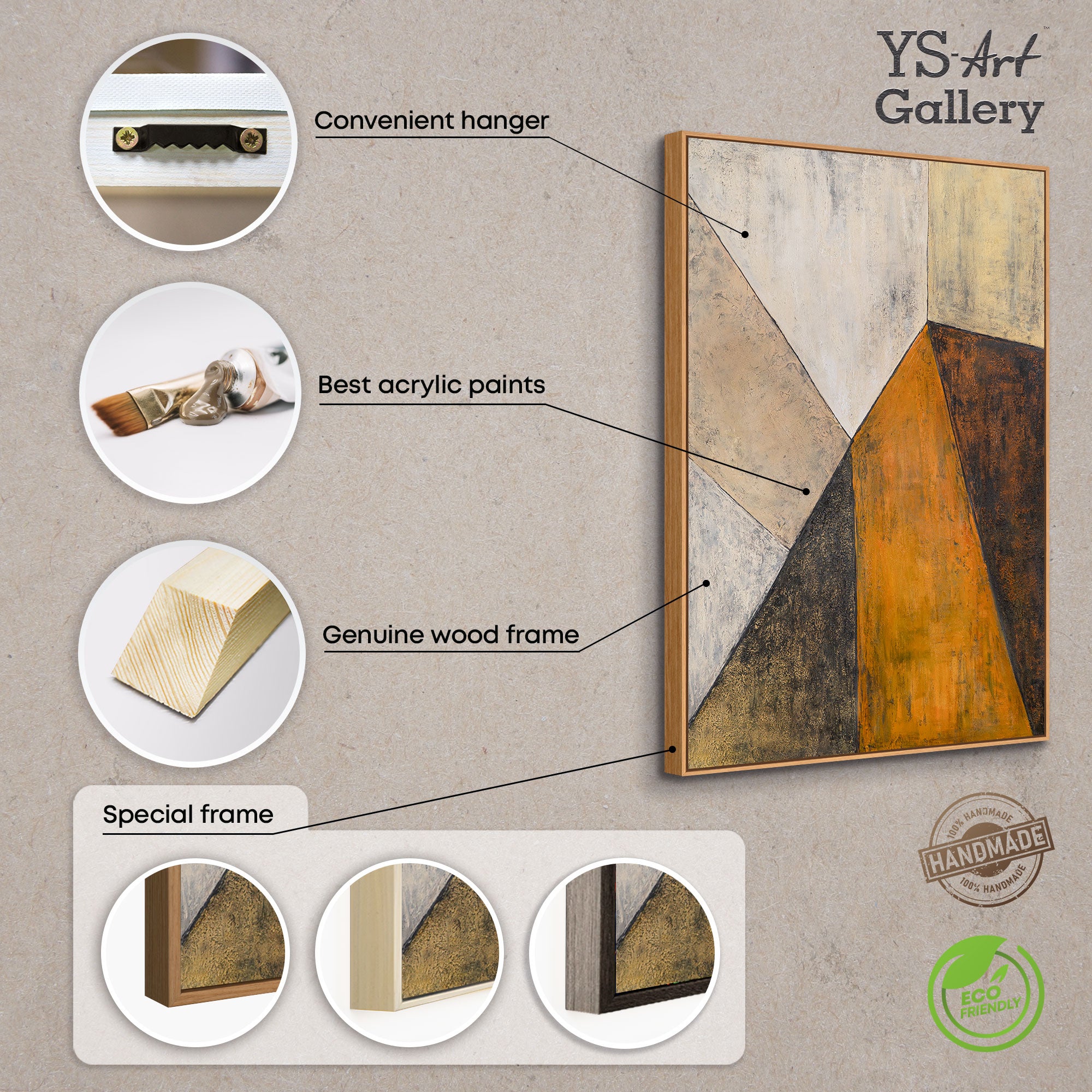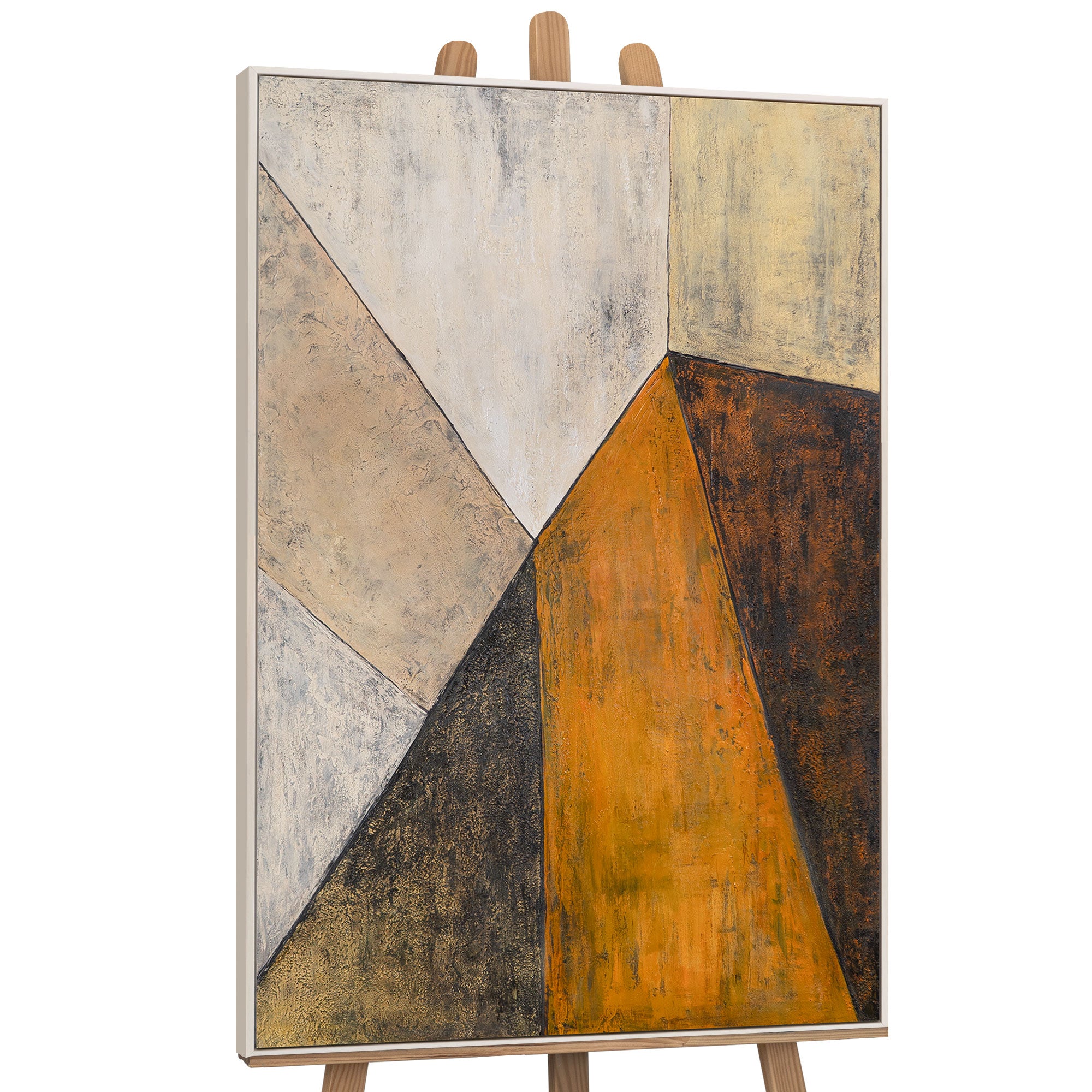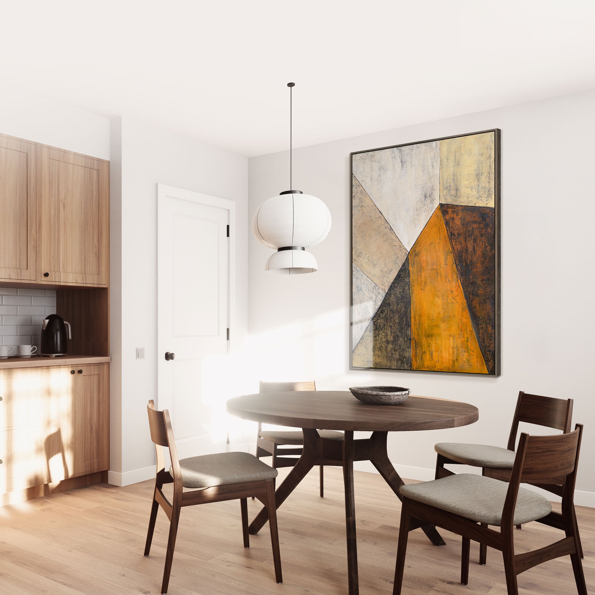 „Spotkanie płaszczyzn” to dialog kolorów i form, w którym miękkie beżowe, czarne i nasycone pomarańczowe płaszczyzny przecinają się, tworząc wrażenie architektonicznej głębi. Strukturalna powierzchnia nadaje dziełu materialności, a kontrast światła i cienia tworzy dynamiczną kompozycję, która przyciąga wzrok.
