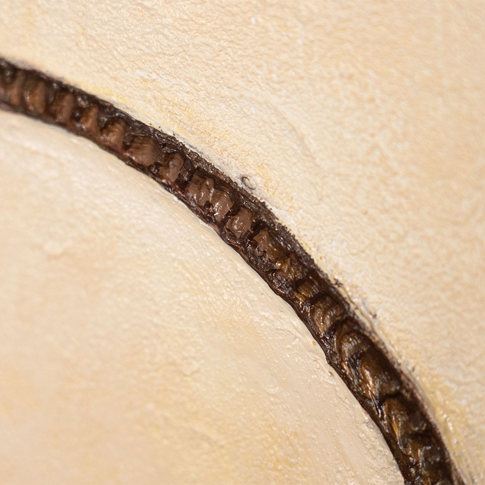 „Zakrzywienie horyzontu” to obraz łagodnego ruchu, łączący spokój i ciepło. Płynne linie tworzą iluzję nieskończonej przestrzeni, a odcienie beżu, ochry i karmelu oddają ciepło promieni słonecznych. Obraz zdaje się oddychać naturą, zachowując rytm wydm i lekkość wiatru.
